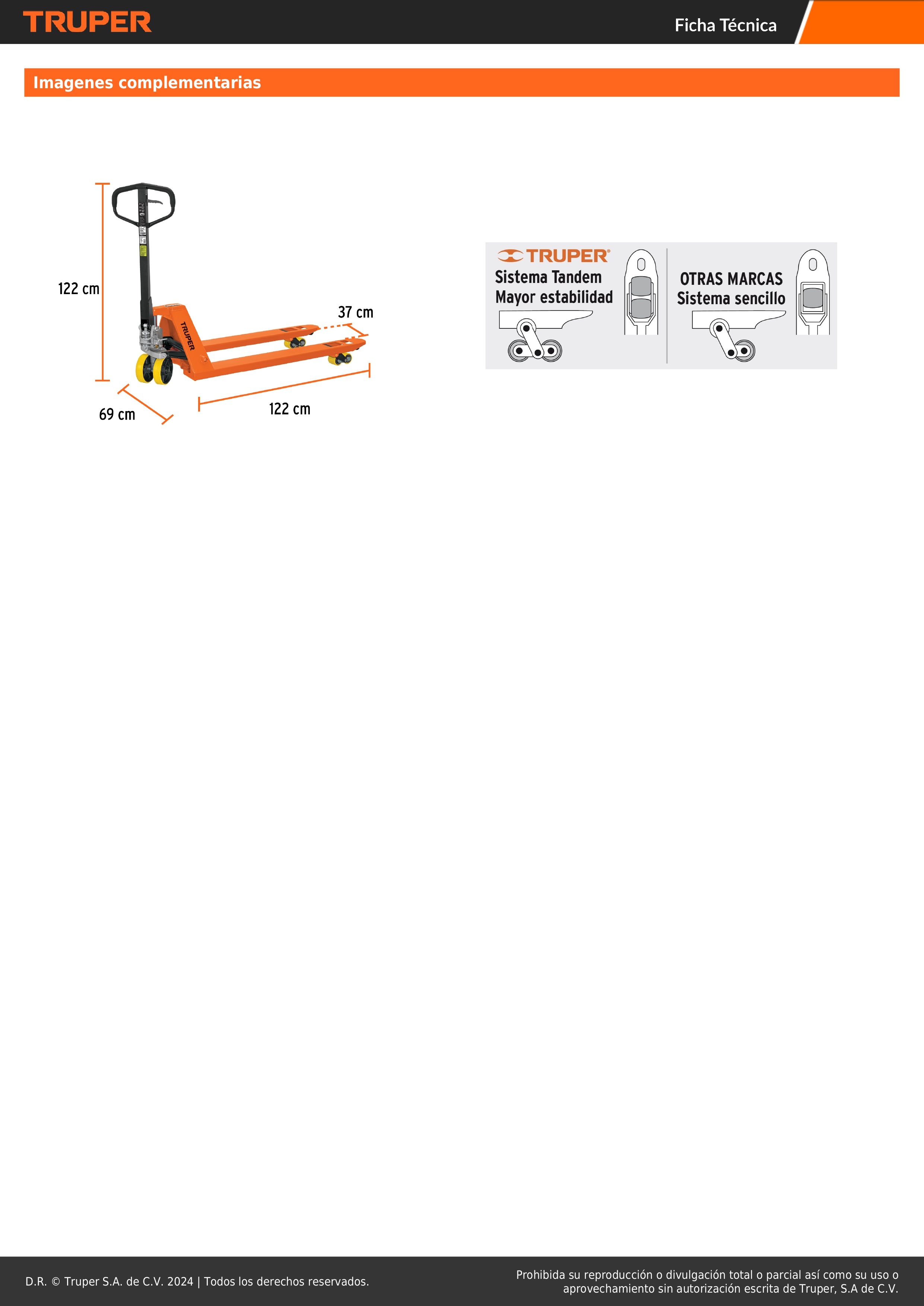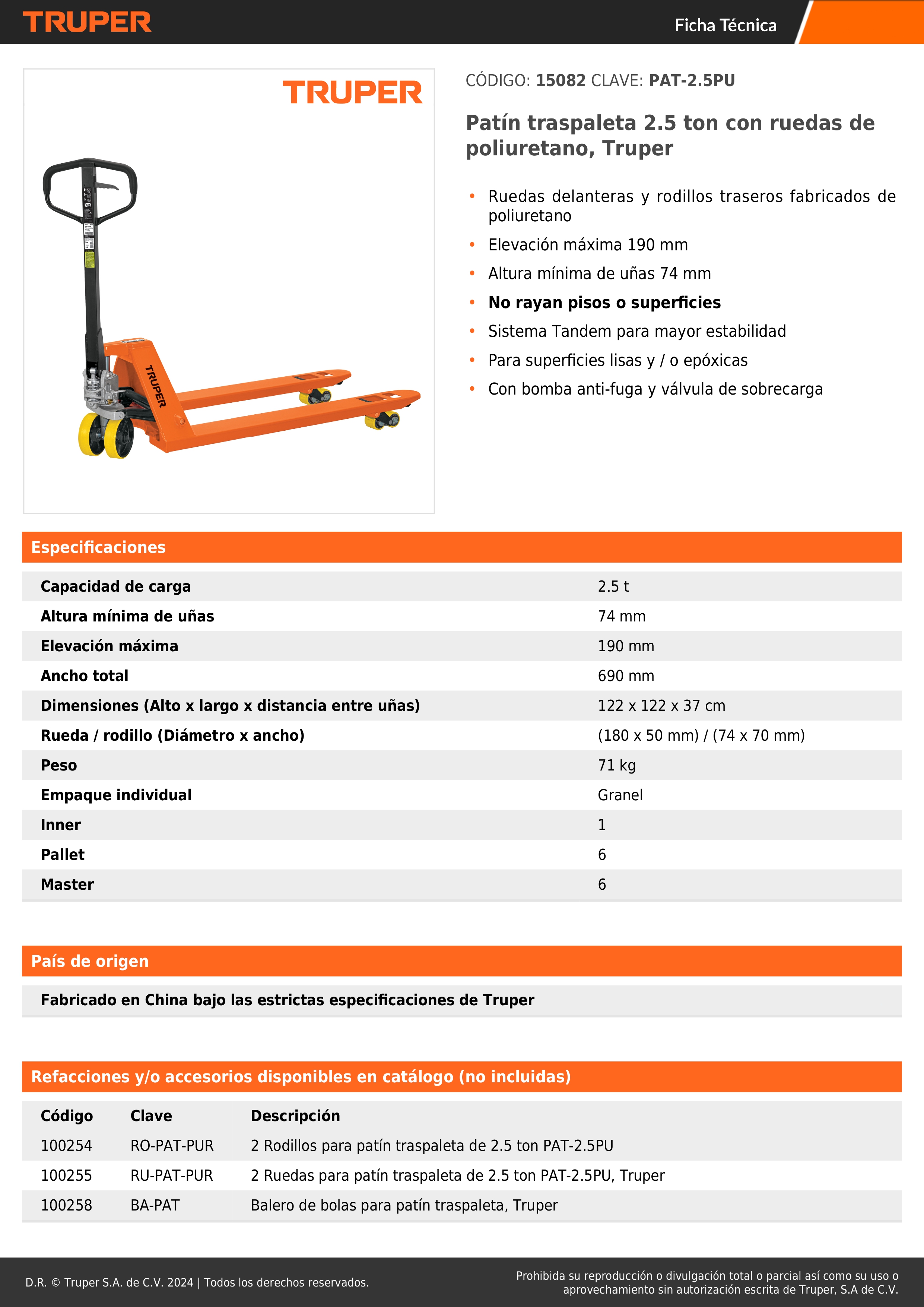Pato Patín traspaleta 2.5 ton con ruedas de poliuretano, Truper