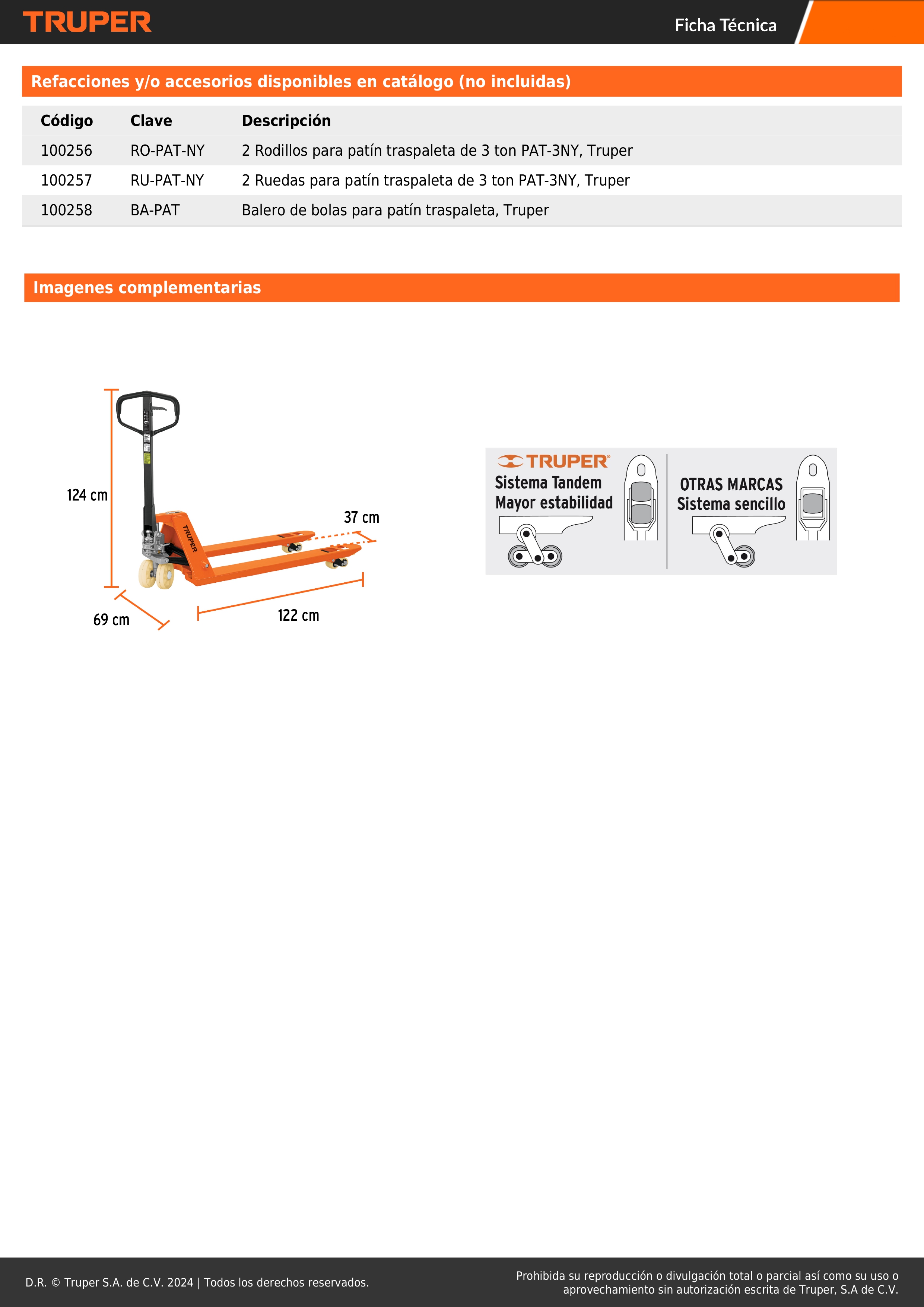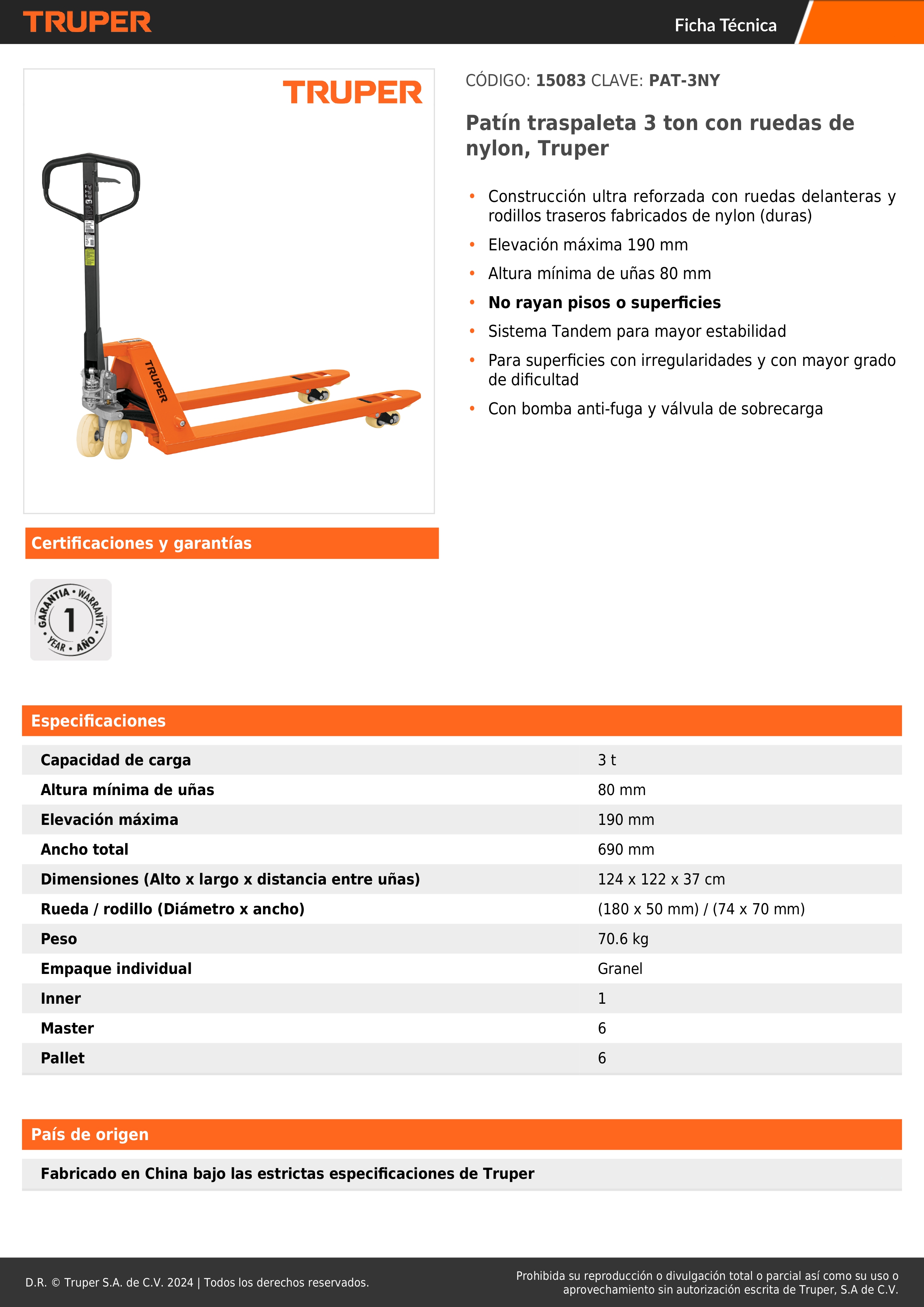 Pato Patín traspaleta 3 ton con ruedas de nylon, Truper