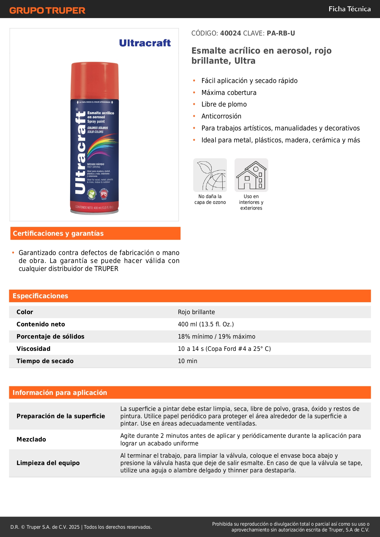 Esmalte acrílico en aerosol, rojo brillante, Ultra
