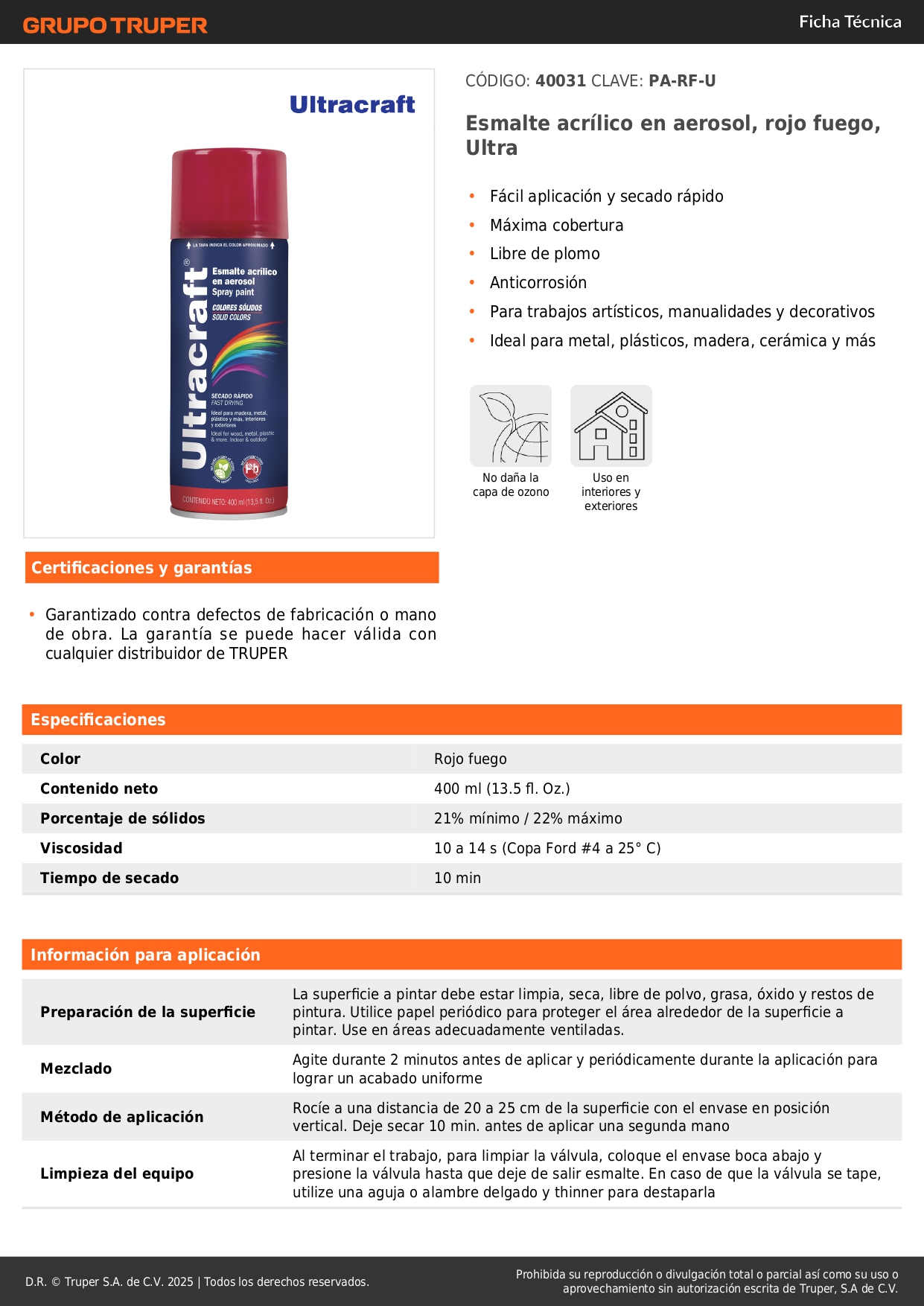 Esmalte acrílico en aerosol, rojo fuego, Ultra