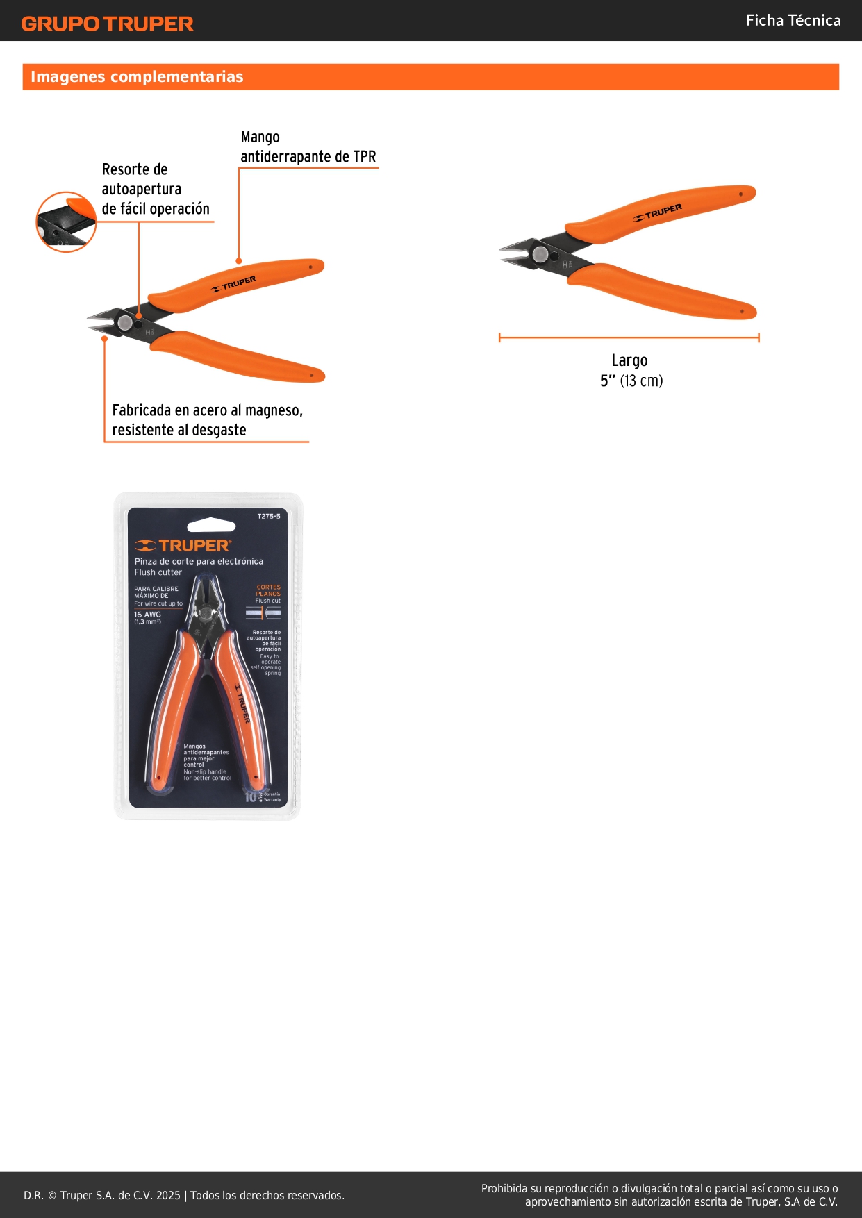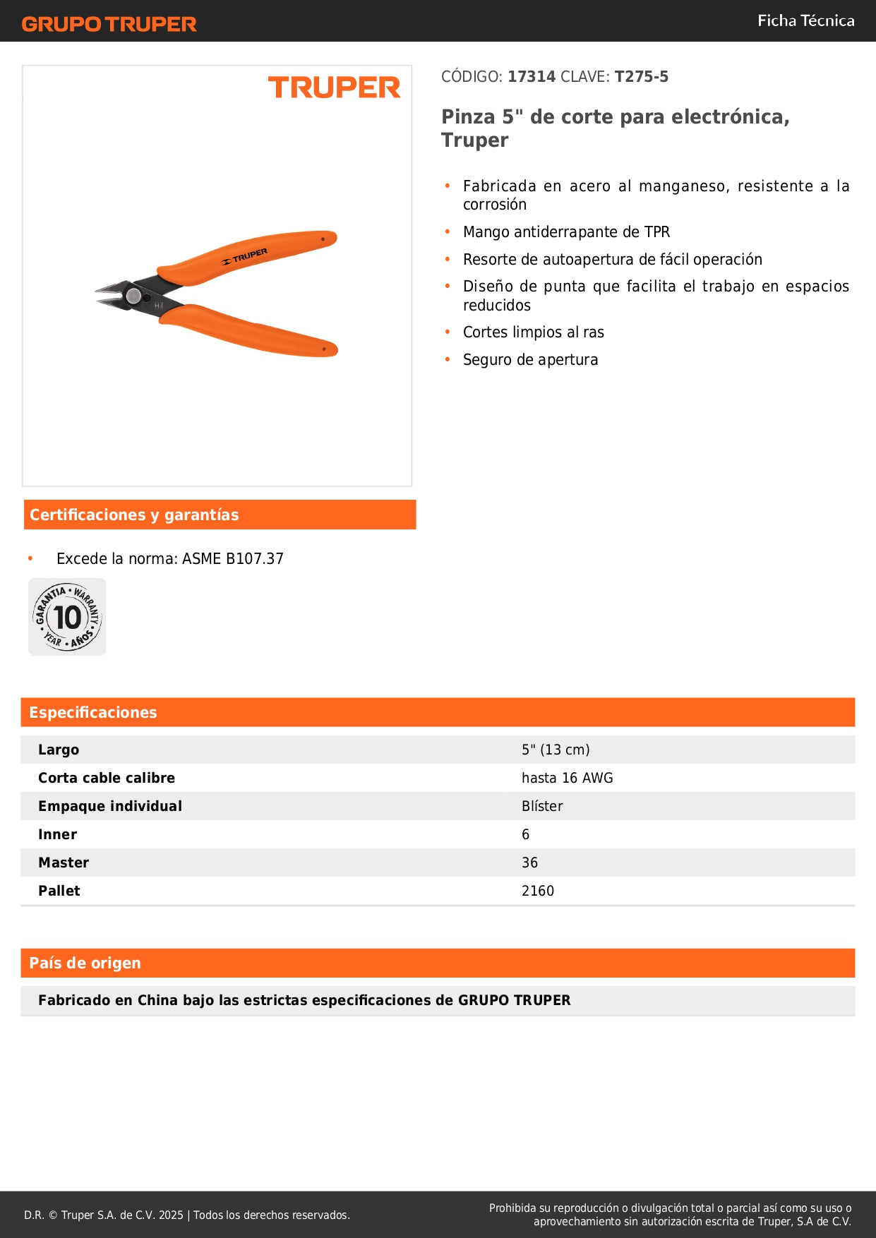 Pinza 5" de corte para electrónica, truper