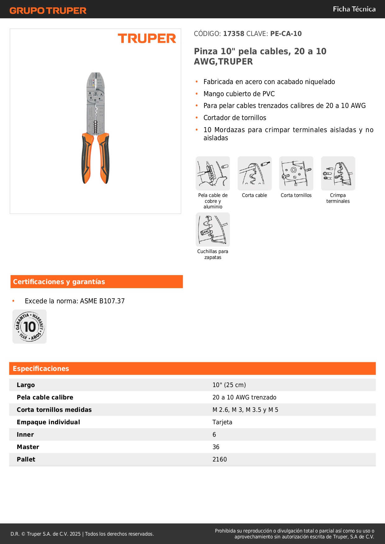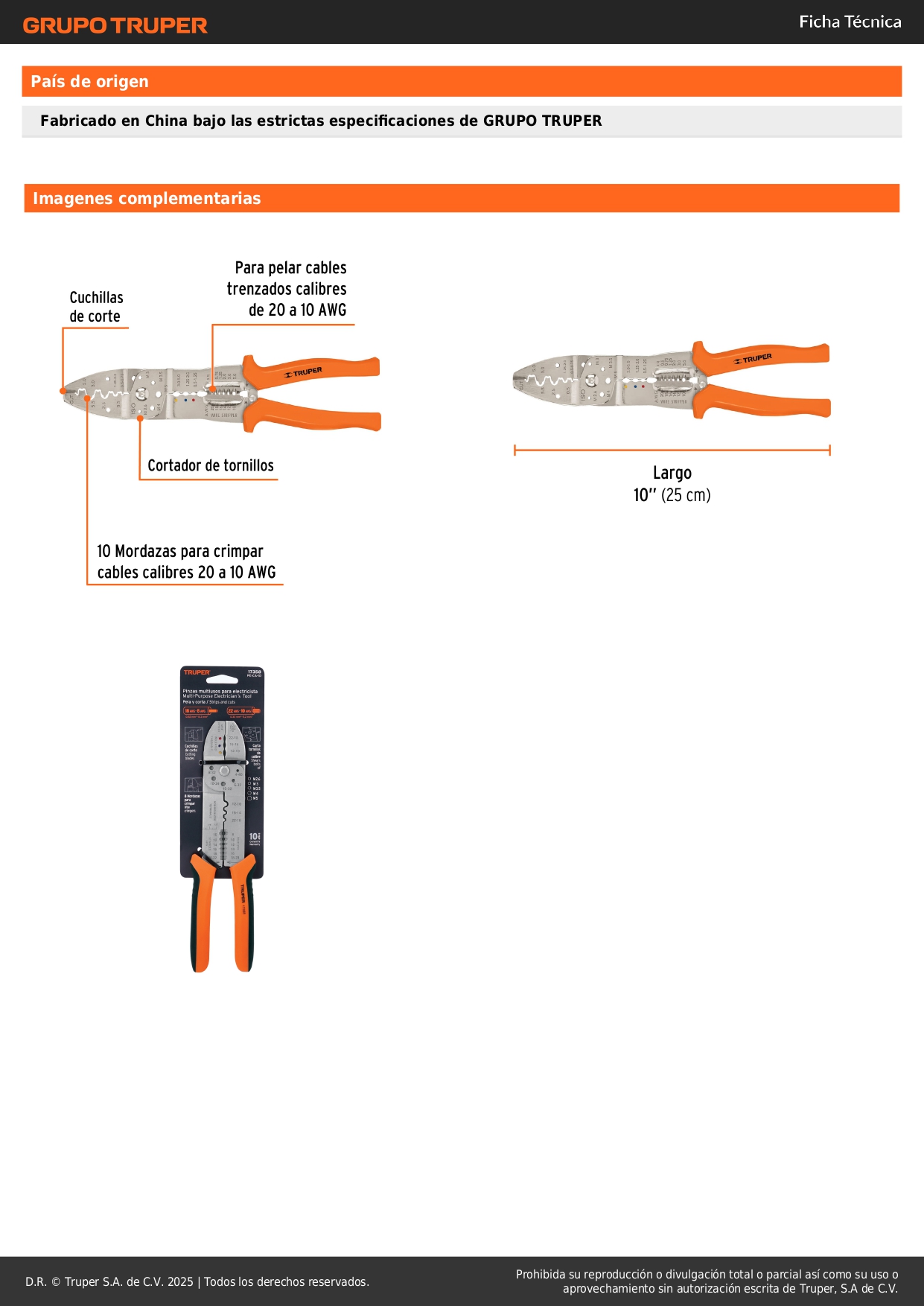 Pinza 10" pela cables, 20 a 10 AWG,TRUPER