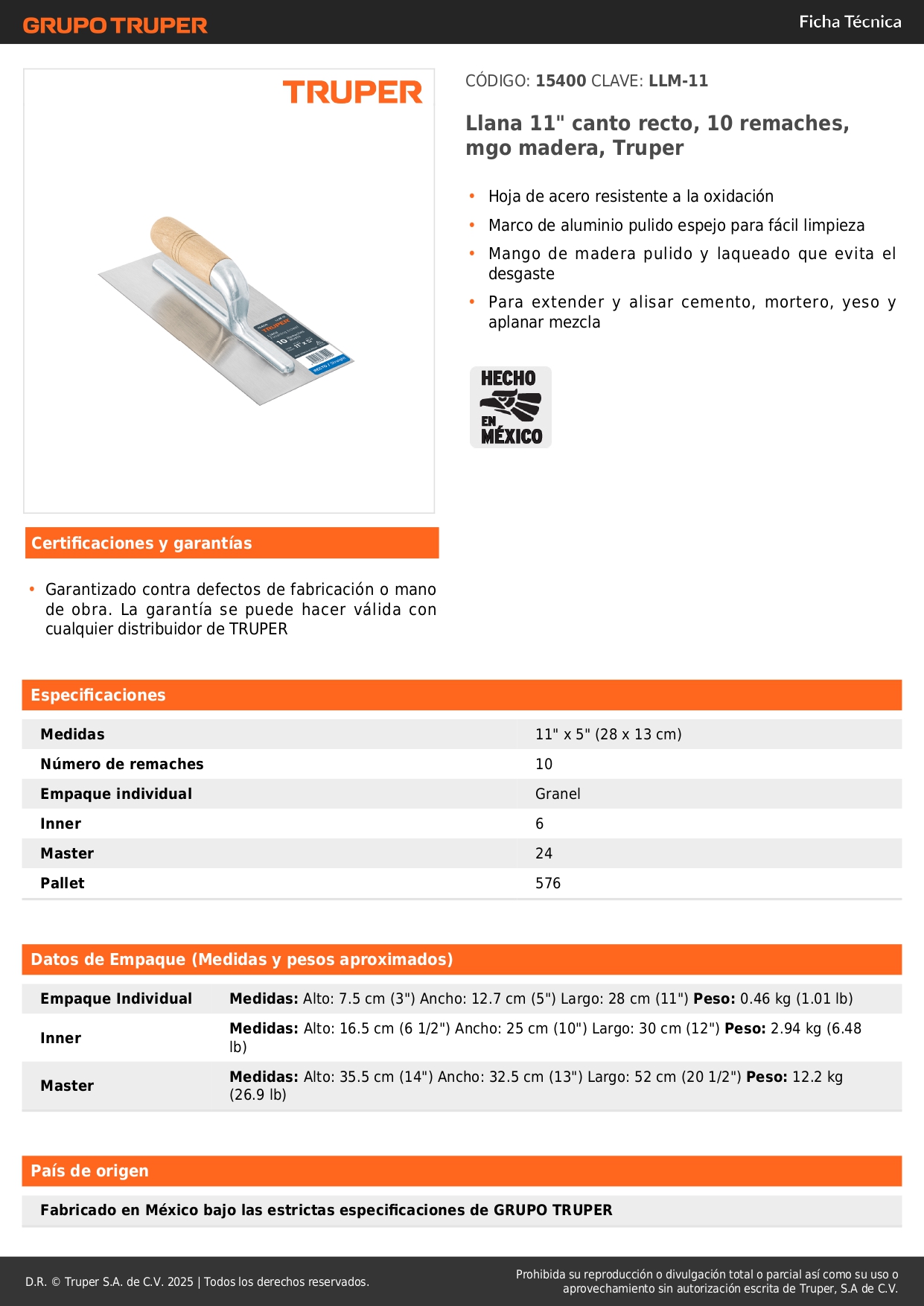Llana 11" canto recto, 10 remaches, mgo madera, Truper