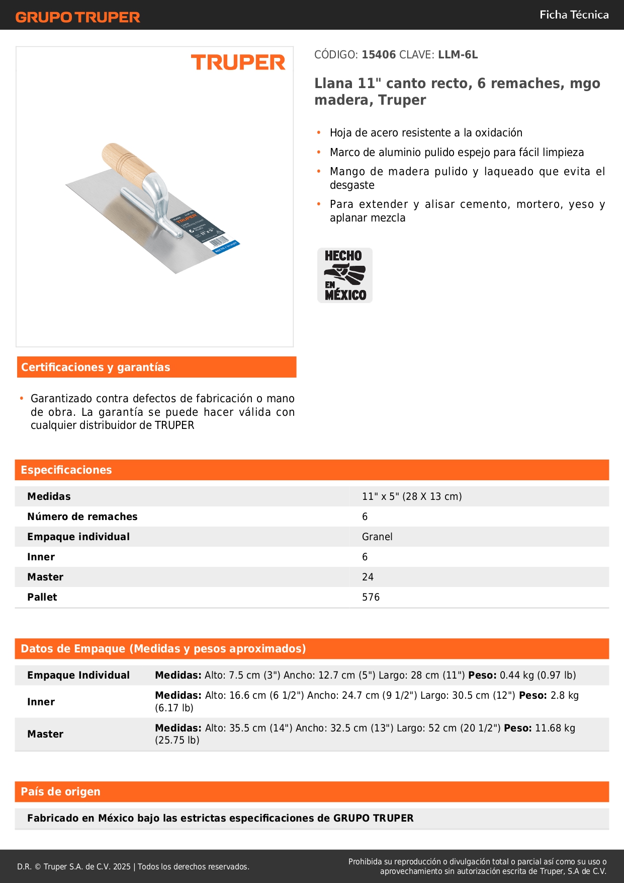 Llana 11" canto recto, 6 remaches, mgo madera, Truper