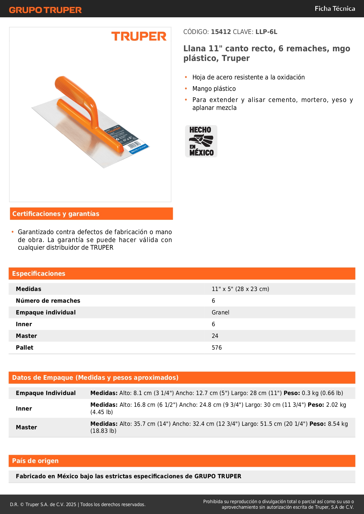 Llana 11" canto recto, 6 remaches, mgo plástico, Truper