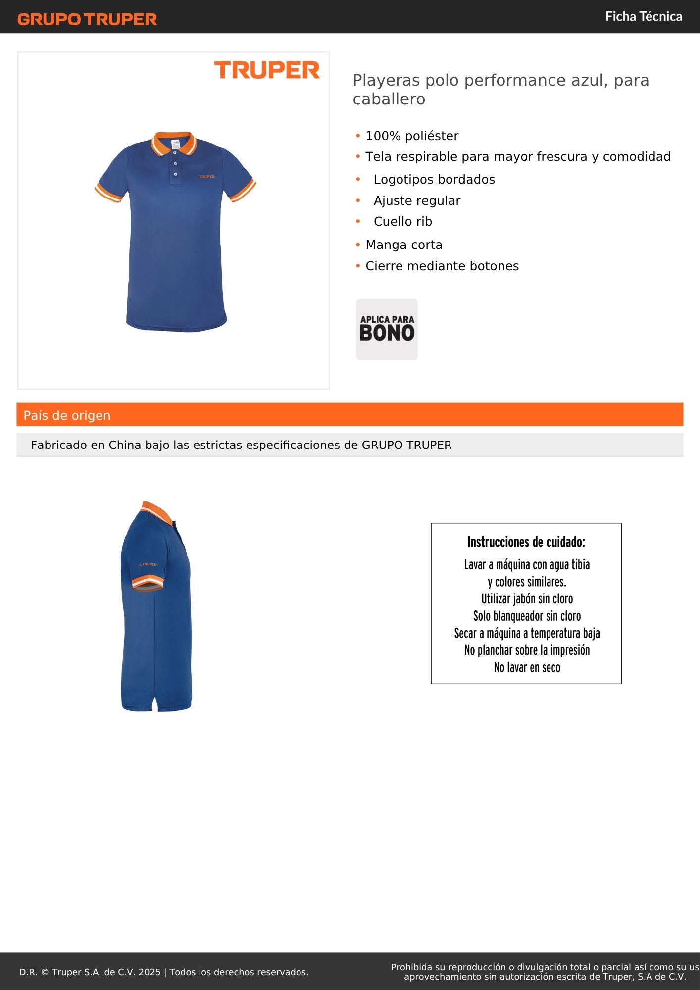 Polo camisero dry fit azul, para caballero, truper S/ 32.40 TALLA S TALLA M TALLA L Agregar al carro Avísame cuando llegue -100% poliéster-Tela respirable para mayor frescura y comodidad-Logotipos bordados-Ajuste regular-Cuello rib