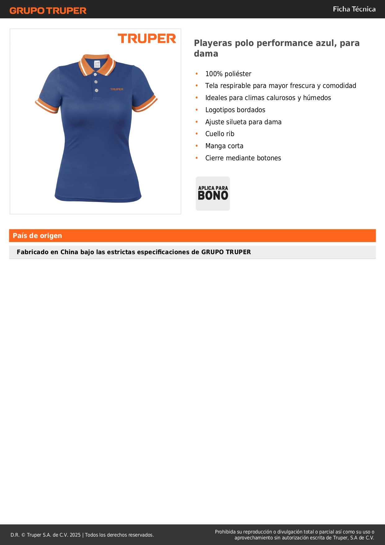 Polo camisero dry fit azul, para dama, truper S/ 32.40 TALLA S TALLA M TALLA L Agregar al carro Avísame cuando llegue -100% poliéster-Tela respirable para mayor frescura y comodidad-Ideal para climas calurosos y húmedos-Logotipos bordados-Ajuste silueta para dama