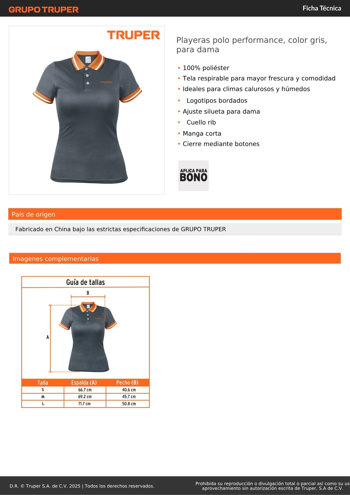 Polo camisero dry fit gris, para dama, truper S/ 32.40 TALLA S TALLA M TALLA L Agregar al carro Avísame cuando llegue -100% poliéster-Tela respirable para mayor frescura y comodidad-Ideales para climas calurosos y húmedos-Logotipos bordados-Ajuste silueta para dama