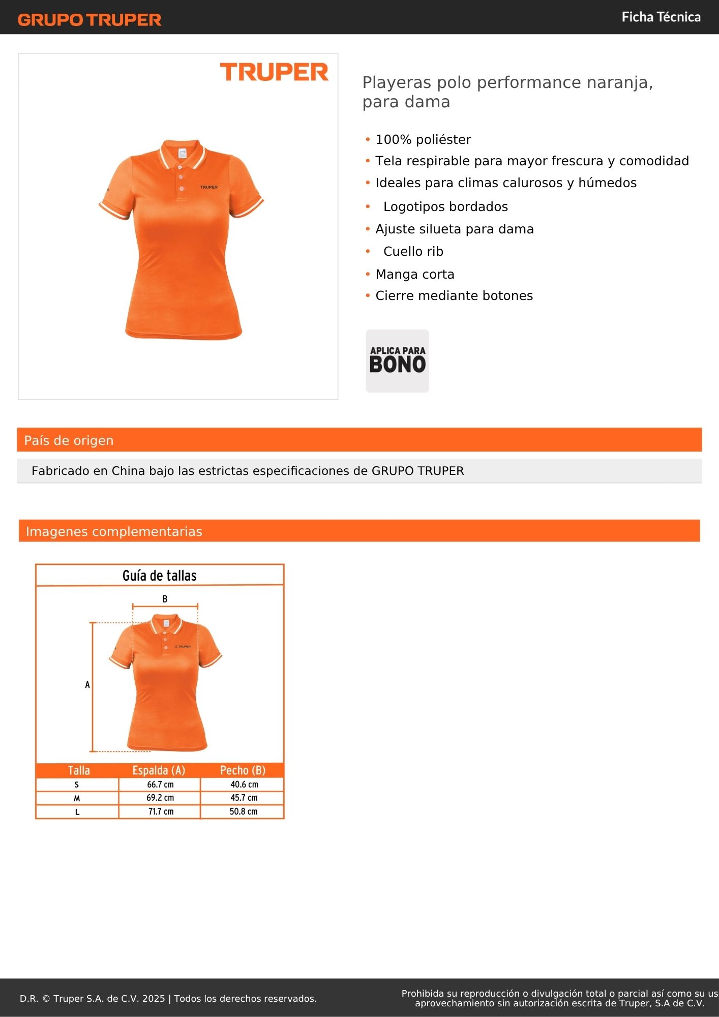 Polo camisero dry fit naranja, para dama truper S/ 32.40 TALLA S TALLA M TALLA L Agregar al carro Avísame cuando llegue -100% poliéster-Tela respirable para mayor frescura y comodidad-Ideales para climas calurosos y húmedos-Logotipos bordados-Ajuste silueta para dama