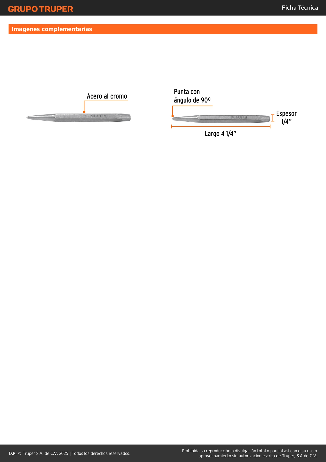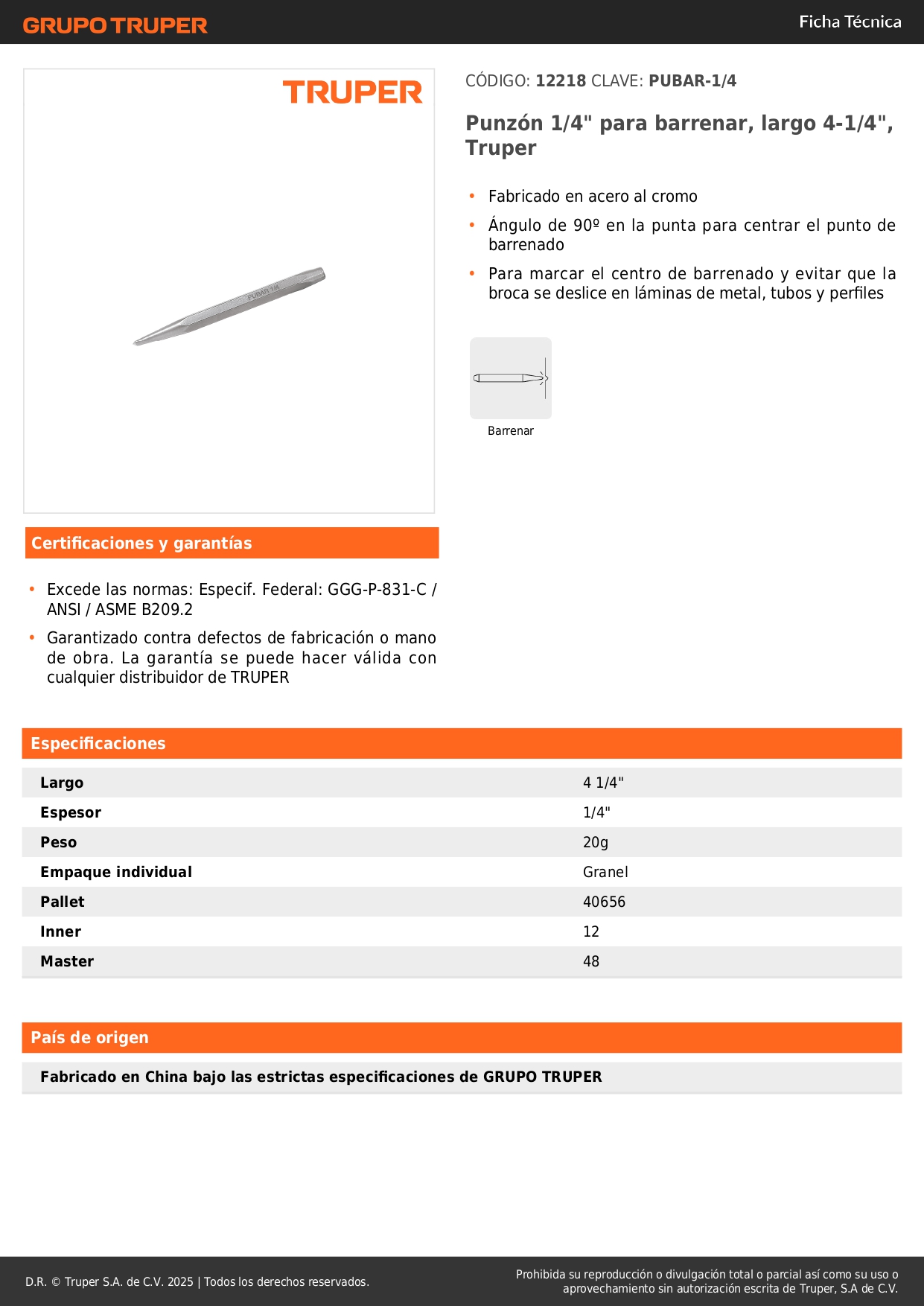 Punzón 1/4´´ para barrenar, largo 4-1/4´´, truper S/ 3.00 Agregar al carro Avísame cuando llegue -Fabricado en acero al cromo-Ángulo de 90º en la punta para centrar el punto de barrenado-Para marcar el centro de barrenado y evitar que la broca se deslice en láminas de metal, tubos y perfiles