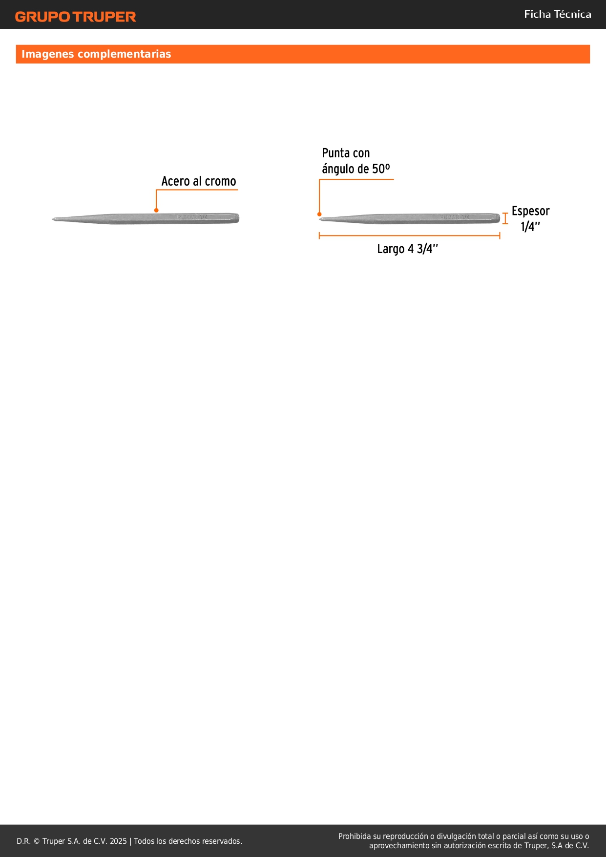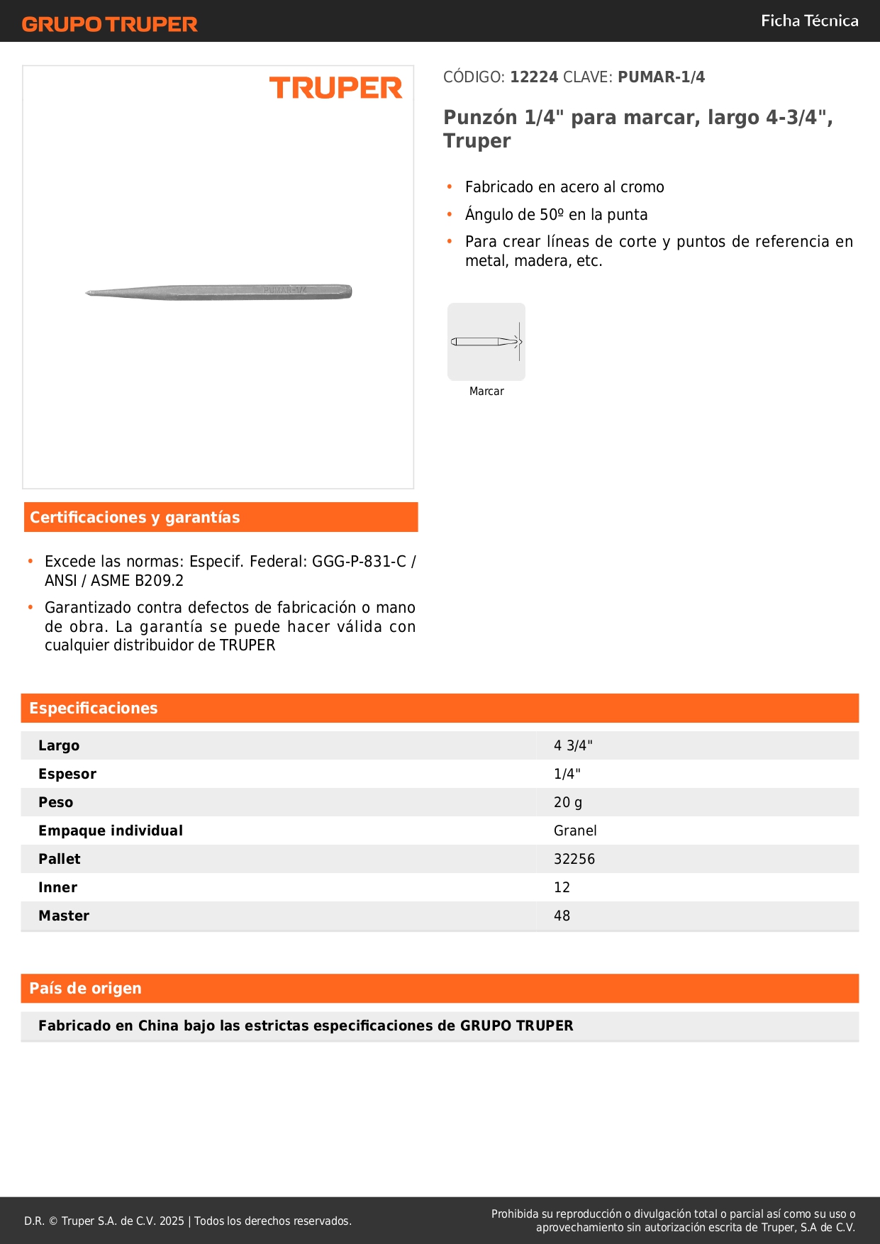 Punzón 1/4'' para marcar largo 4-3/4'' truper S/ 4.00 Agregar al carro Avísame cuando llegue -Fabricado en acero al cromo-Ángulo de 50º en la punta-Para crear líneas de corte y puntos de referencia en metal, madera, etc.