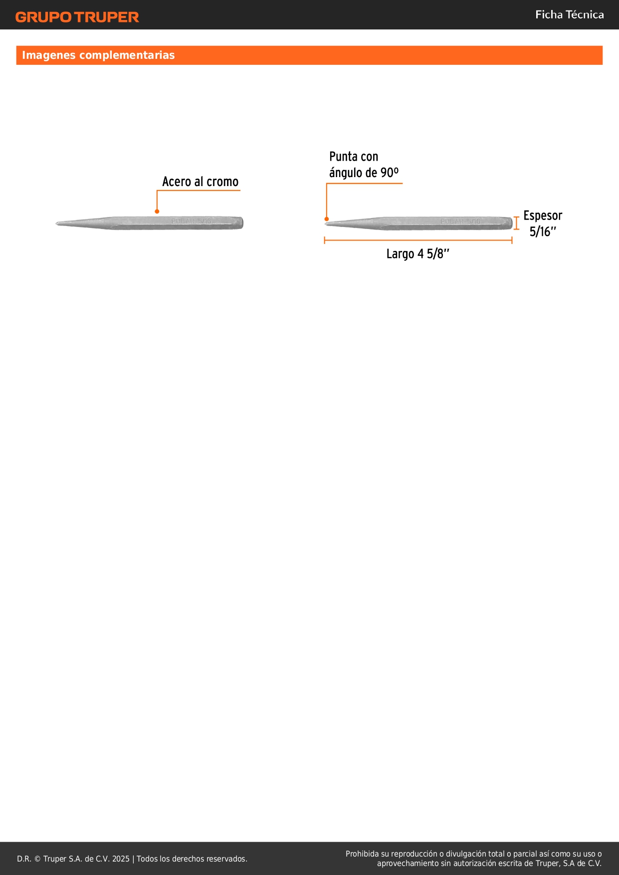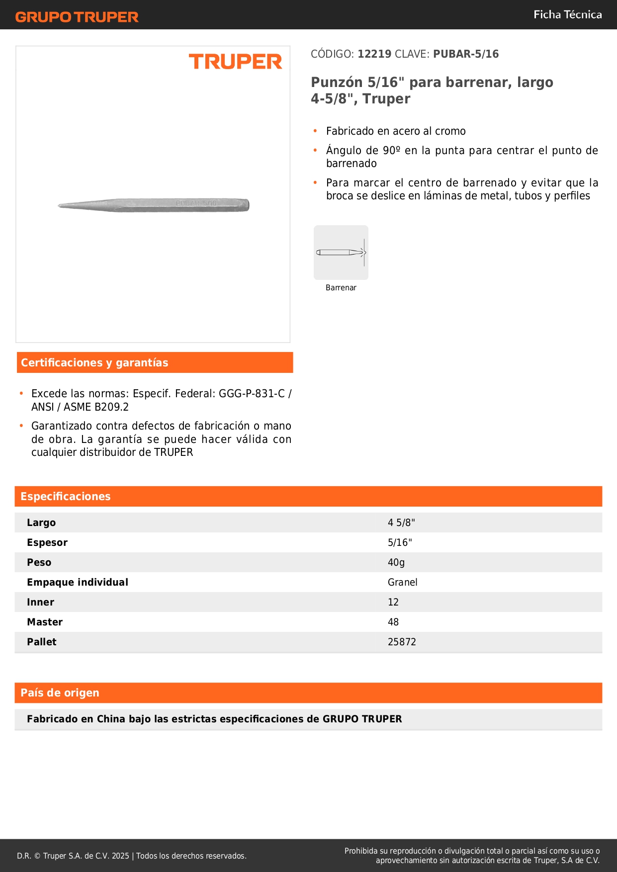 Punzón 5/16´´ para barrenar, largo 4-5/8´´, truper S/ 3.40 Agregar al carro Avísame cuando llegue -Fabricado en acero al cromo-Ángulo de 90º en la punta para centrar el punto de barrenado-Para marcar el centro de barrenado y evitar que la broca se deslice en láminas de metal, tubos y perfiles