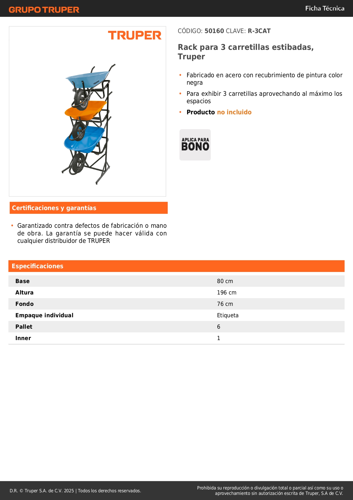 Rack para 3 carretillas estibadas truper, truper S/ 569.00 Agregar al carro Avísame cuando llegue -Fabricado en acero con recubrimiento de pintura color negra-Para exhibir 3 carretillas aprovechando al máximo los espacios-Producto no incluido