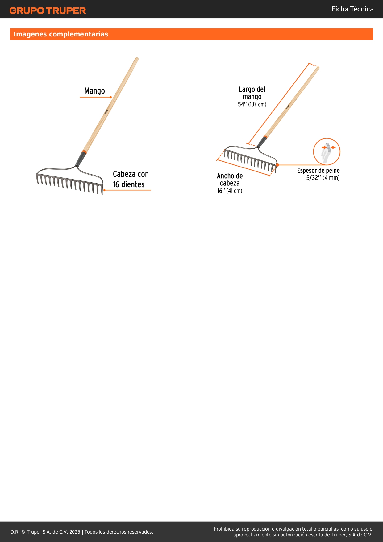 Rastrillo jardinero classic. 16 dientes. mango 54''. truper