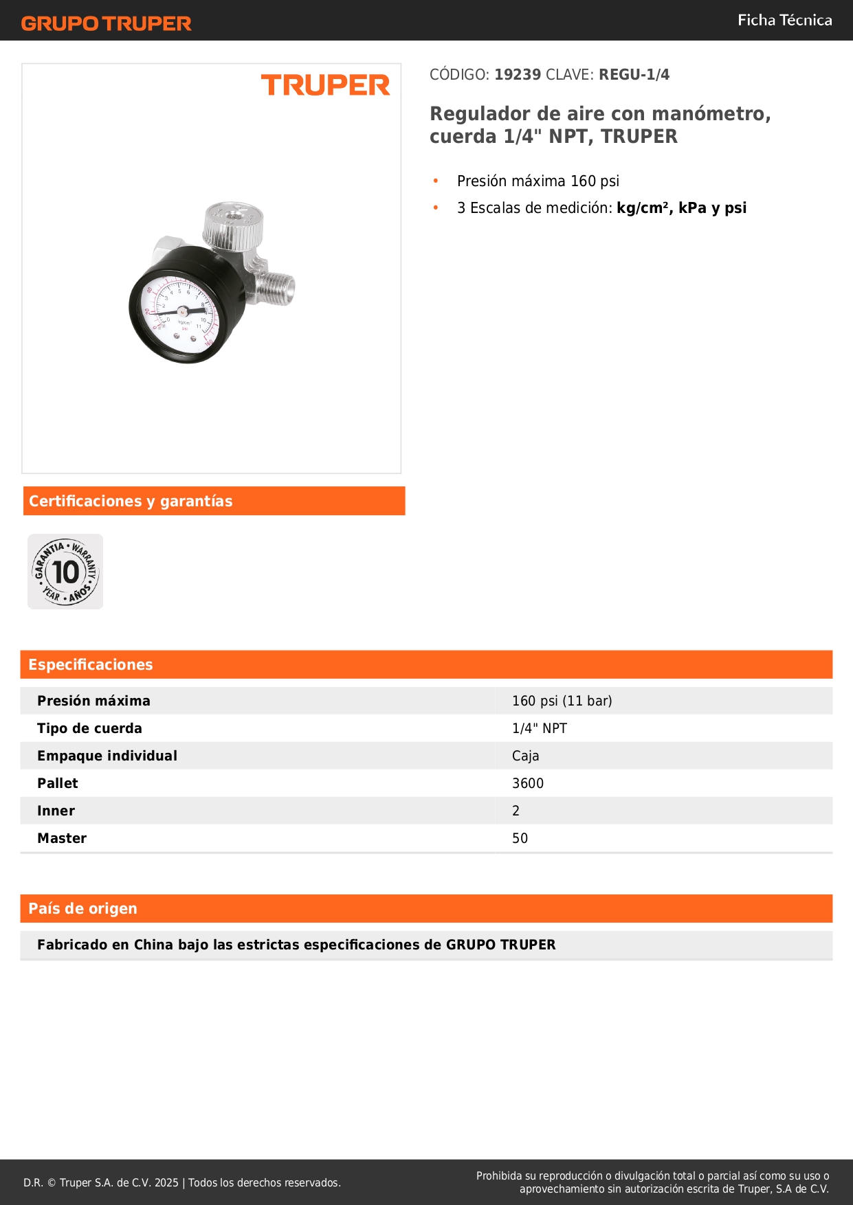 Regulador de aire con manómetro, cuerda 1/4" NPT, TRUPER