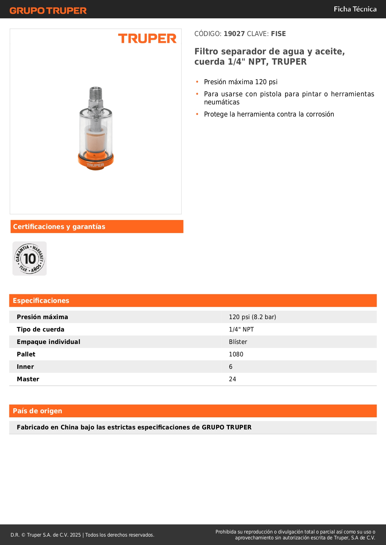 Filtro separador de agua y aceite, cuerda 1/4" NPT, TRUPER