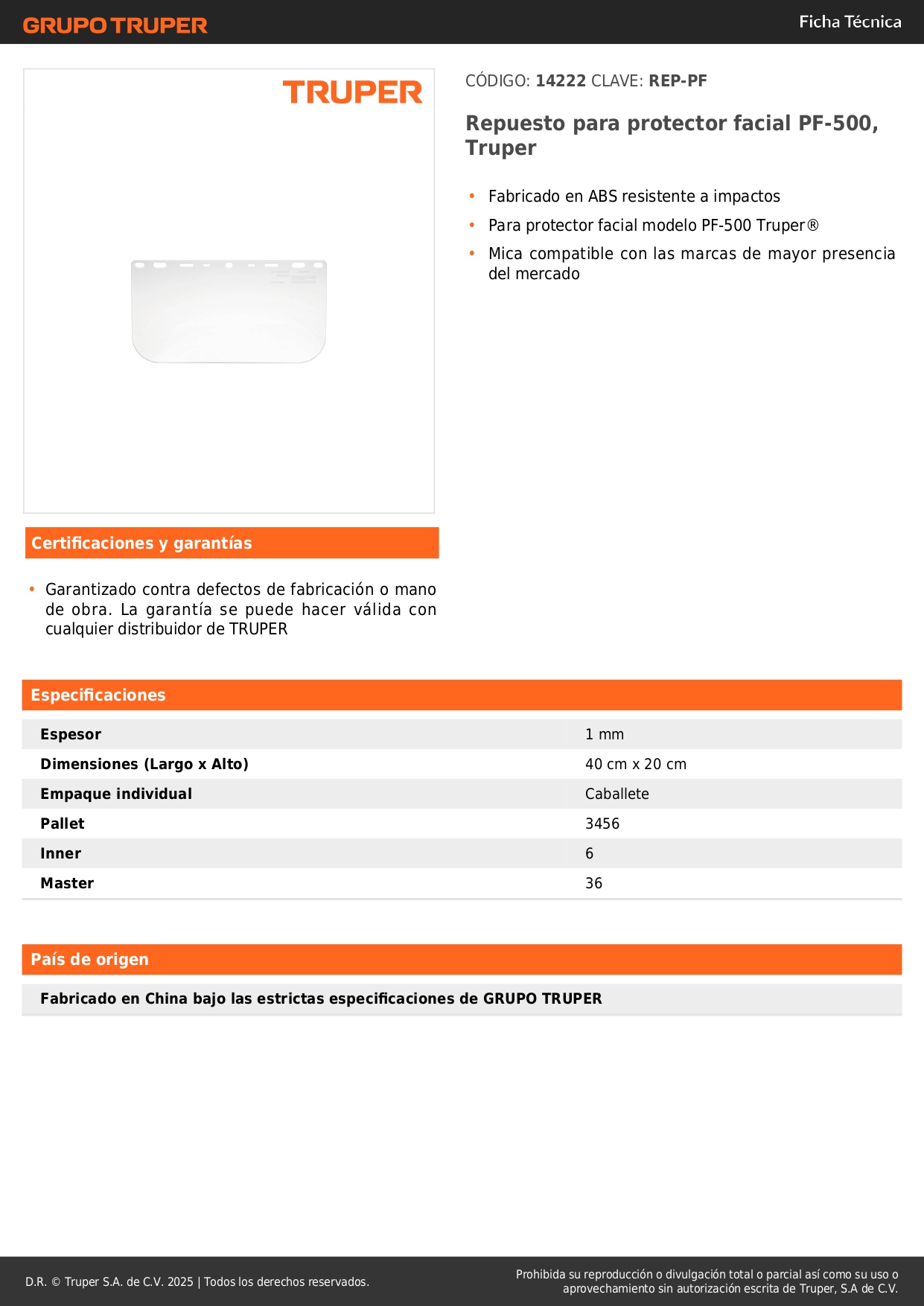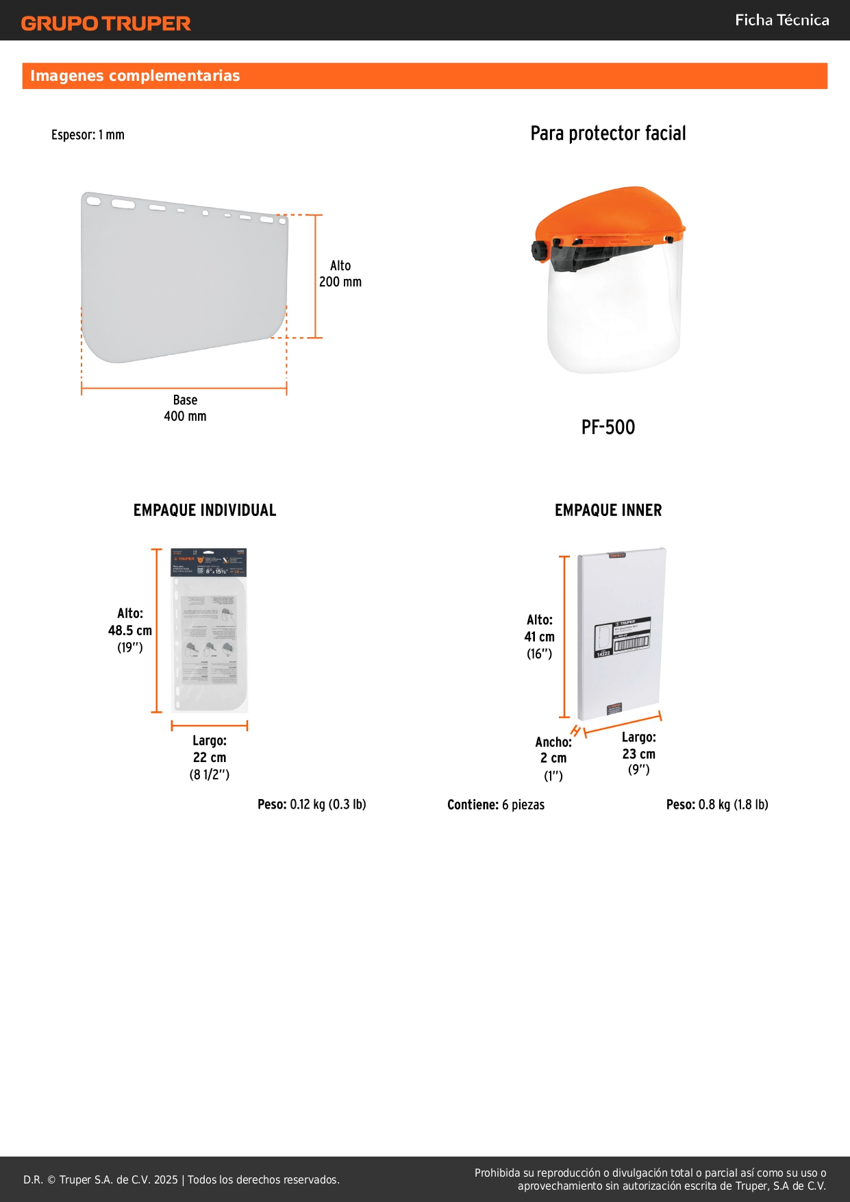 Repuesto para protector facial pf-500, truper S/ 20.20 Agregar al carro Avísame cuando llegue -Fabricado en ABS resistente a impactos-Para protector facial modelo PF-500 Truper®-Mica compatible con las marcas de mayor presencia del mercado