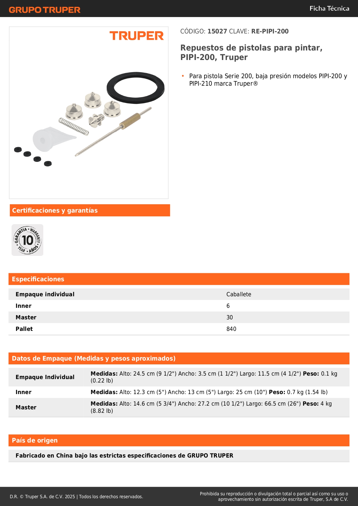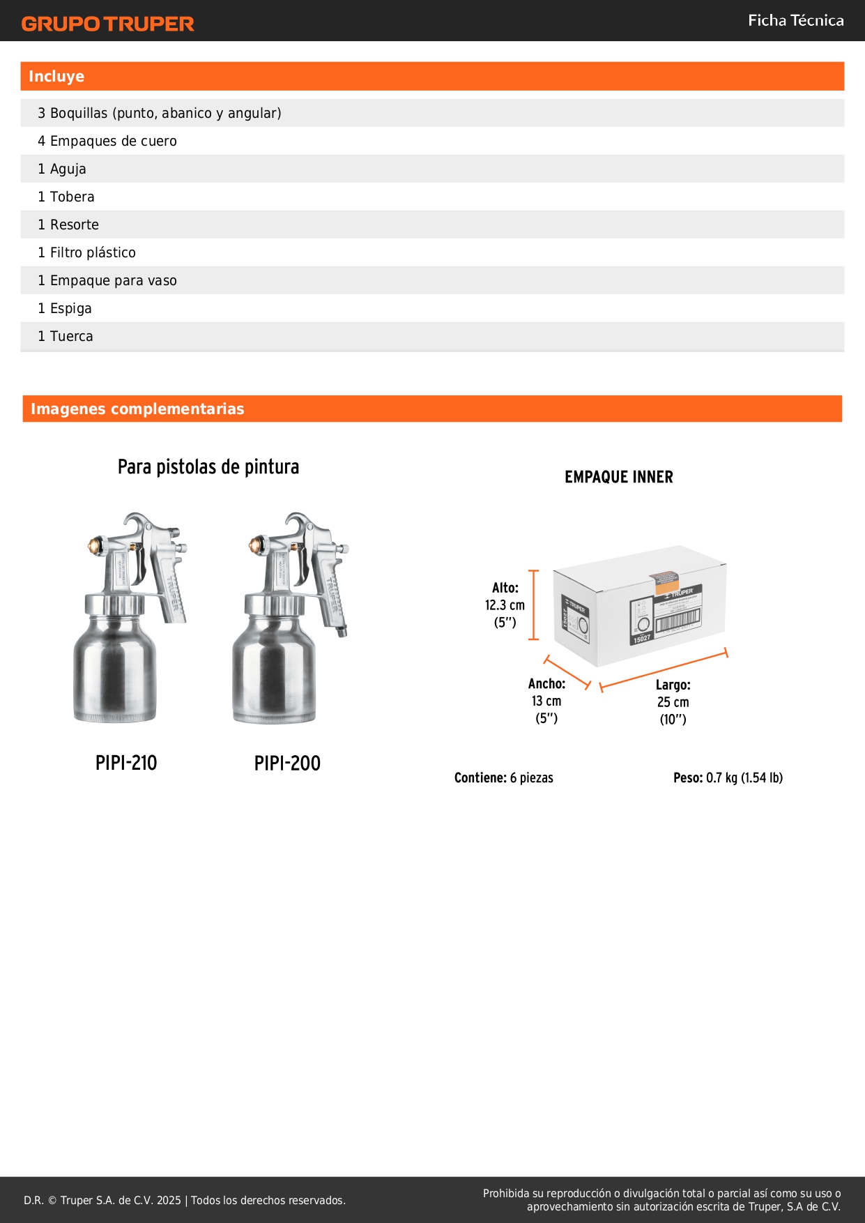 Repuestos de pistolas para pintar, pipi-200, truper S/ 25.30 Agregar al carro Avísame cuando llegue -Para pistola Serie 200, baja presión modelos PIPI-200 y PIPI-210 marca Truper®