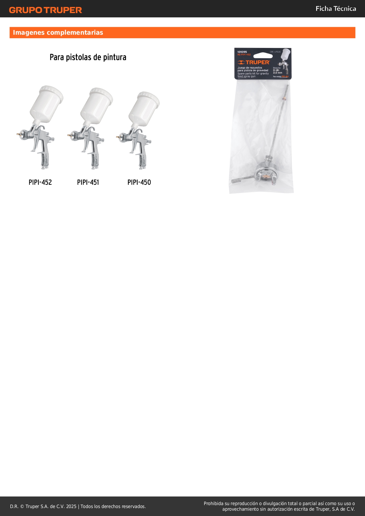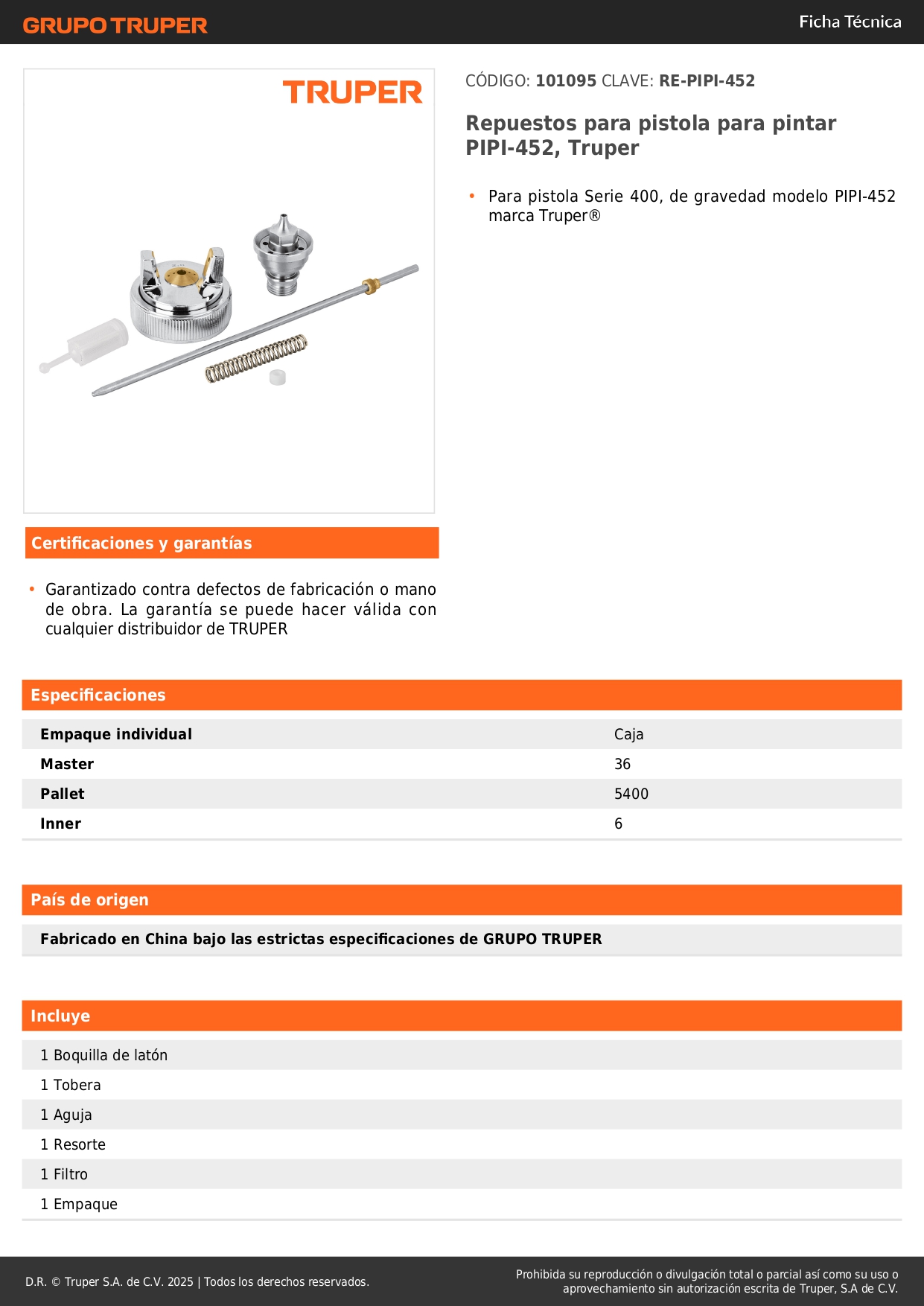 Repuestos para pistola para pintar pipi-452, truper S/ 40.70 Agregar al carro Avísame cuando llegue -Para pistola Serie 400, de gravedad modelo PIPI-452 marca Truper®