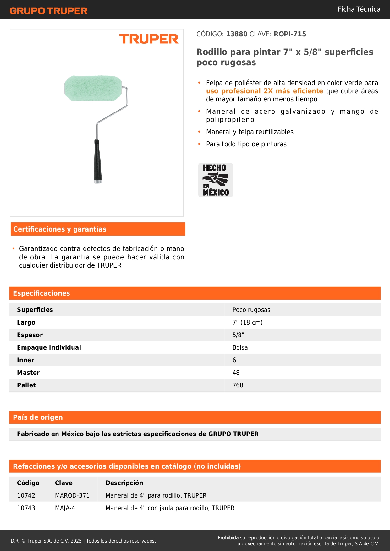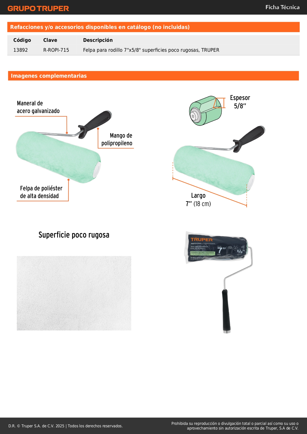 Rodillo para pintar 7'' x 5/8'' superficies lisas truper