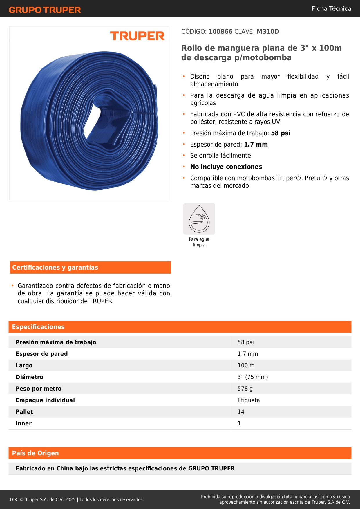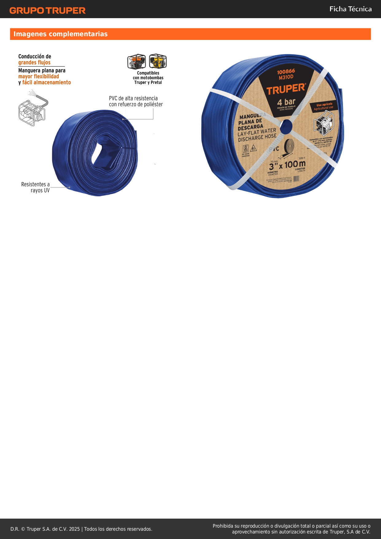 • Fabricada con PVC de alta resistencia con refuerzo de poliéster, resistente a rayos UV