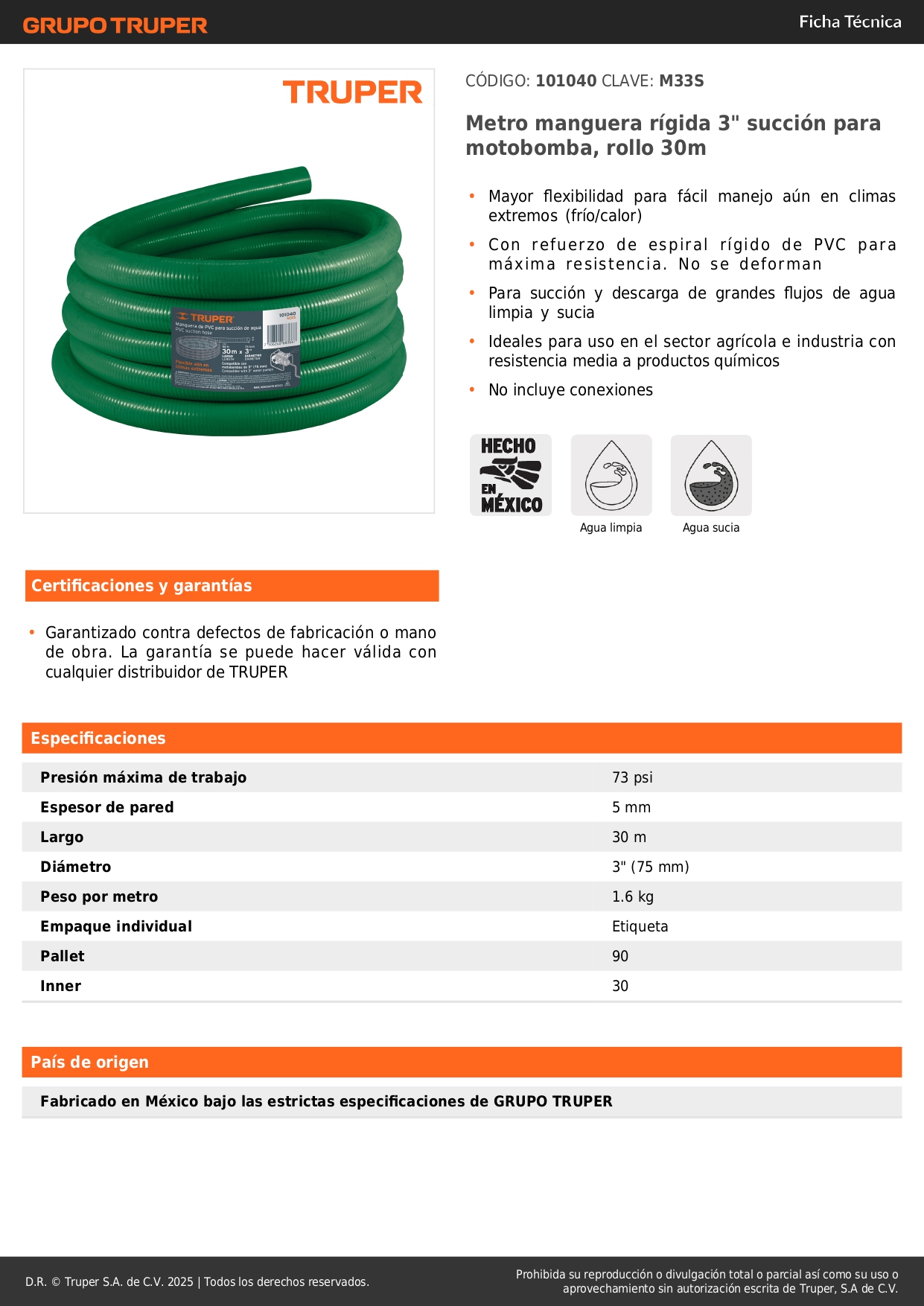Metro manguera rígida 3" succión para motobomba, rollo 30 m