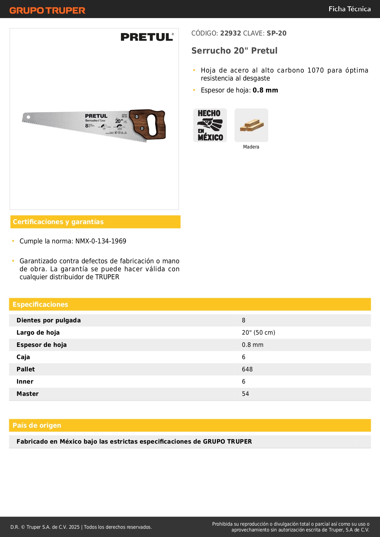 Serrucho 20' pretul S/ 16.50 Agregar al carro Avísame cuando llegue -Hoja de acero al alto carbono 1070 para óptima resistencia al desgaste-Espesor de hoja: 0.8 mm