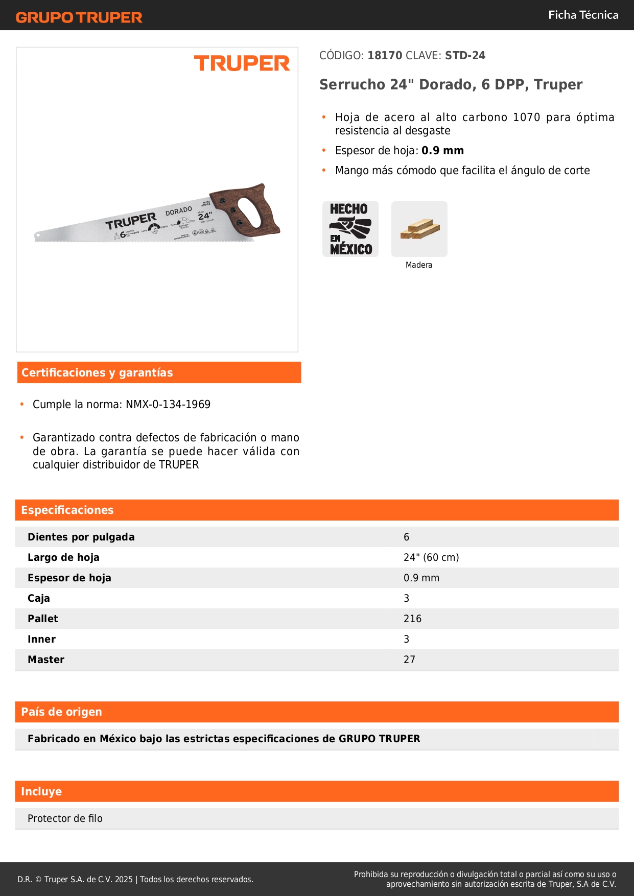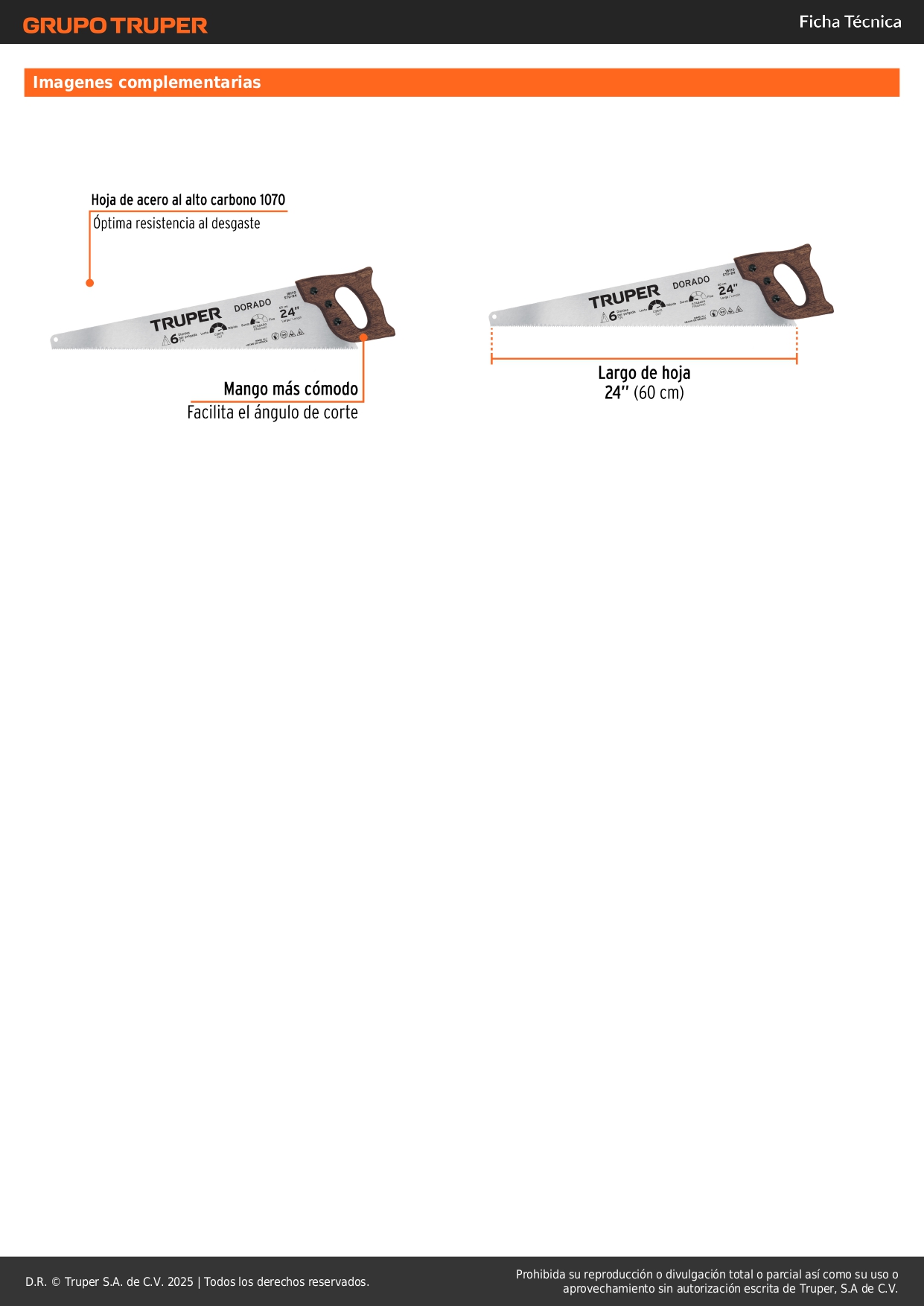 Serrucho 24'' dorado 6 dpp truper S/ 31.50 Agregar al carro Avísame cuando llegue -Hoja de acero al alto carbono 1070 para óptima resistencia al desgaste-Espesor de hoja: 0.9 mm-Mango más cómodo que facilita el ángulo de corte