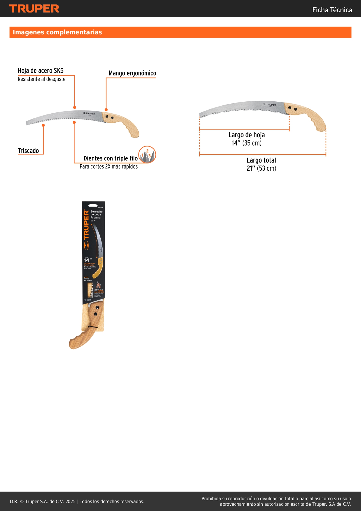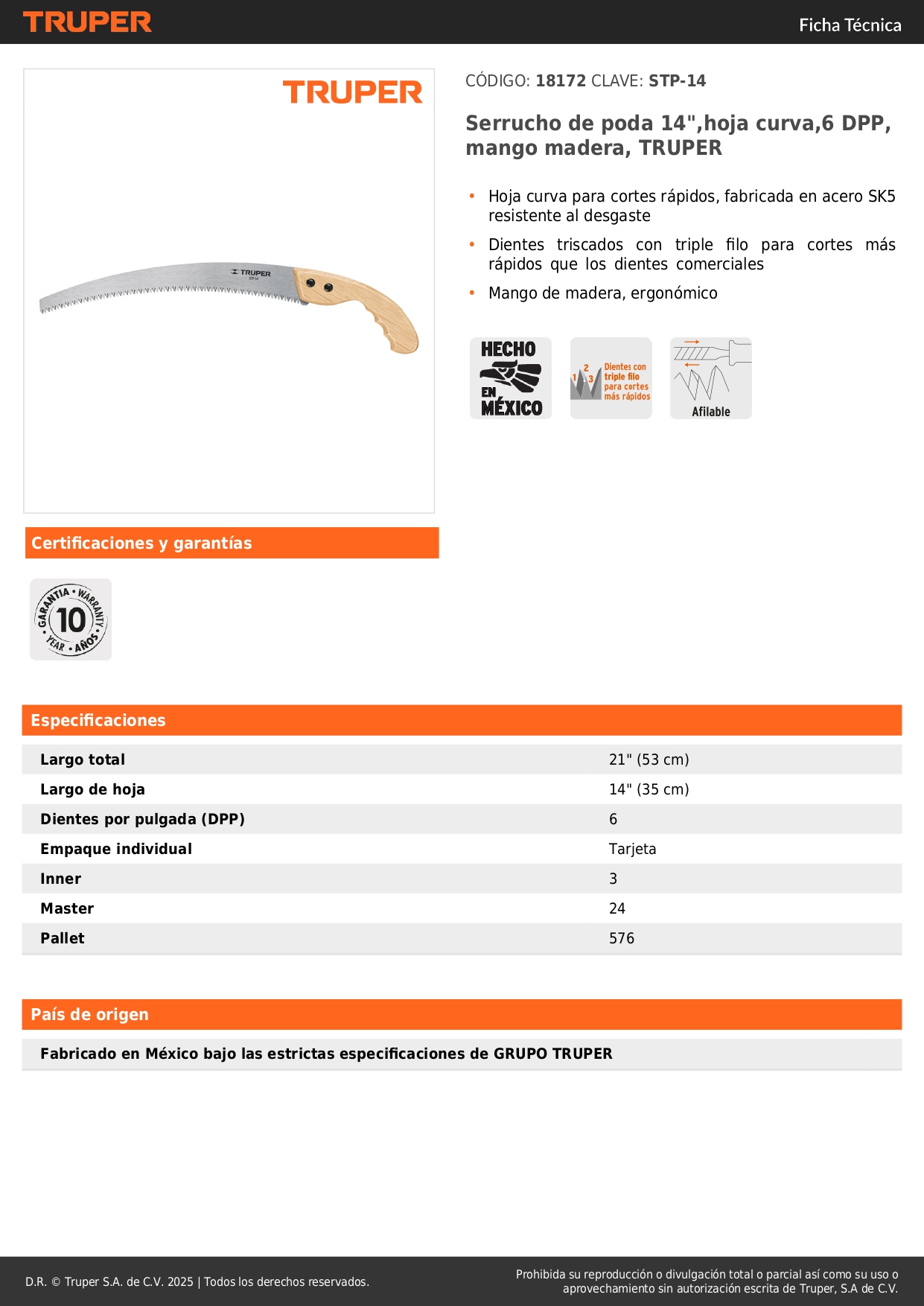 Serrucho de poda 14",hoja curva,6 DPP, mango madera, TRUPER