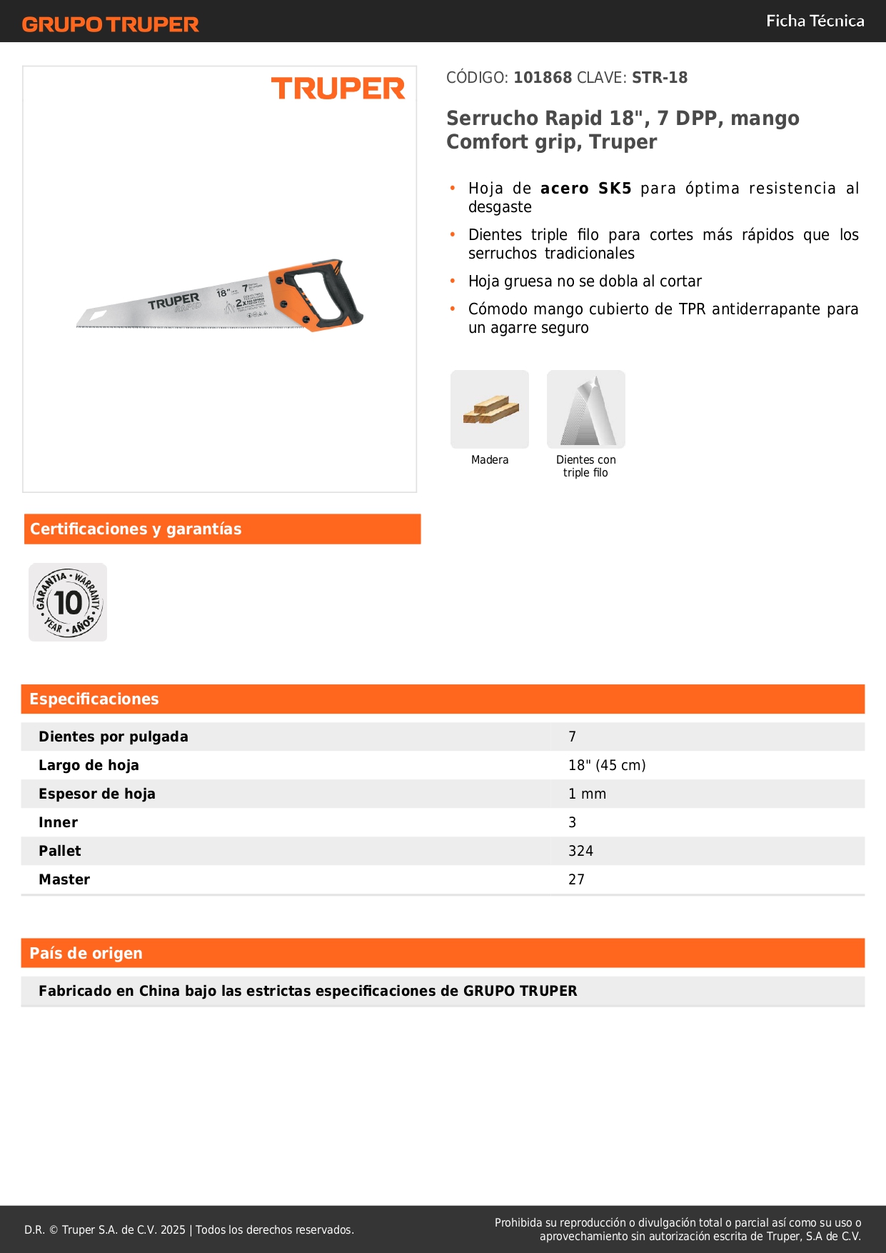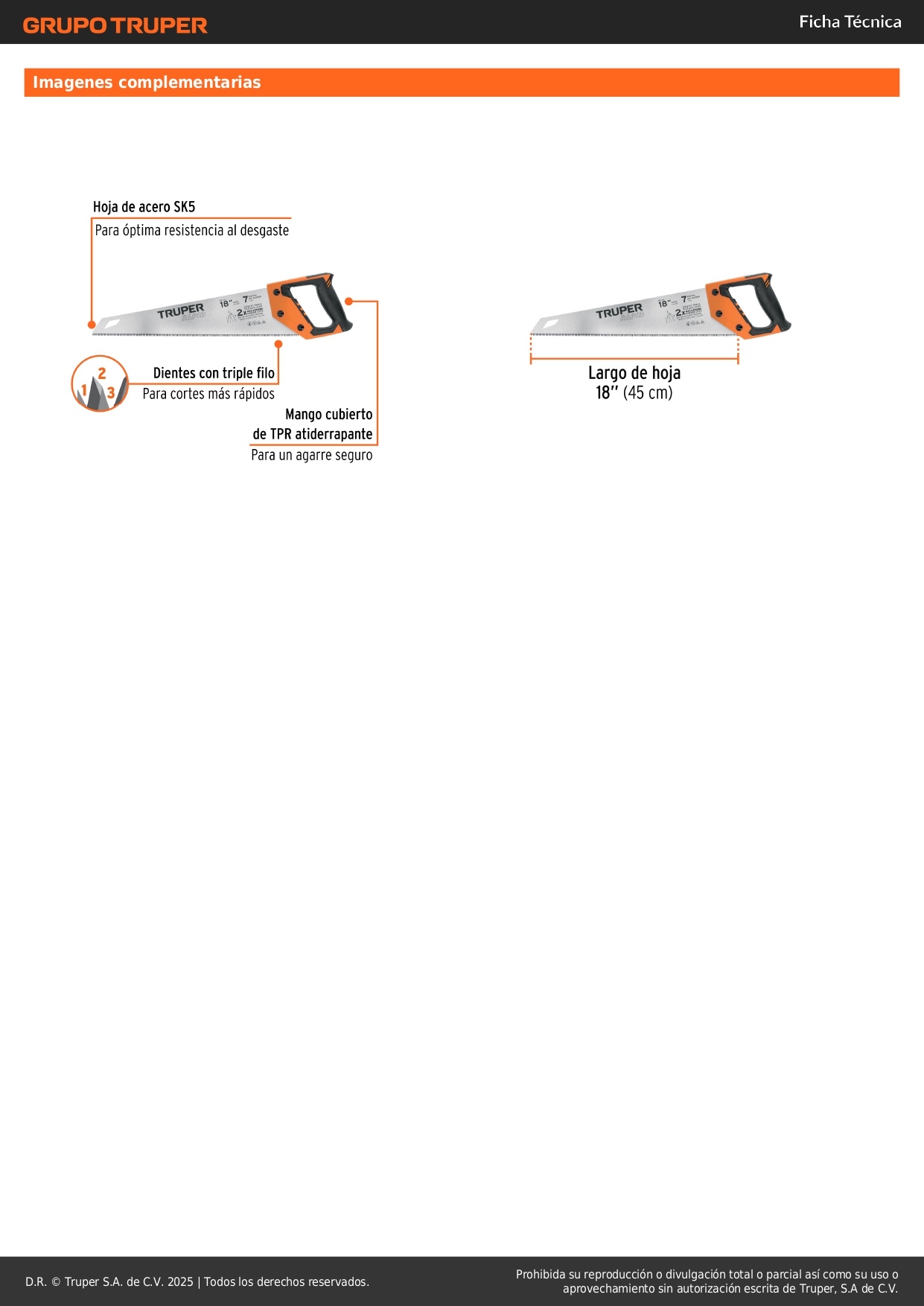 Serrucho rapid 18'' 7 dpp mango comfort grip truper