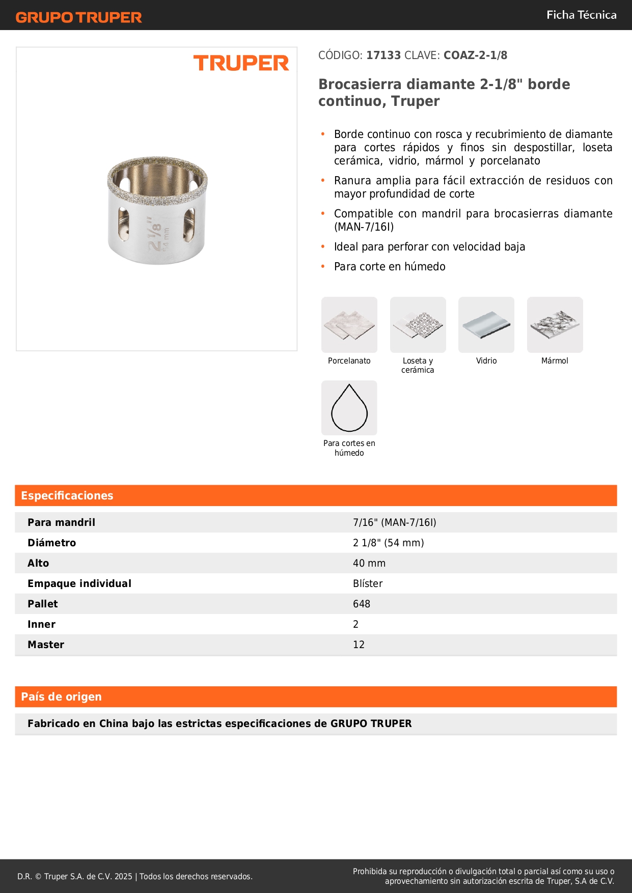 -Borde continuo con rosca y recubrimiento de diamante para cortes rápidos y finos sin despostillar, loseta cerámica, vidrio, mármol y porcelanato