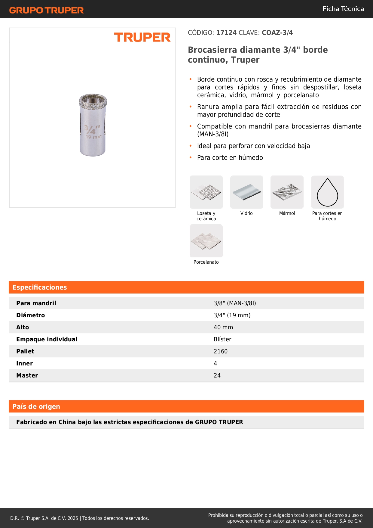 Sierra copa con diamante 3/4´´ borde continuo, truper