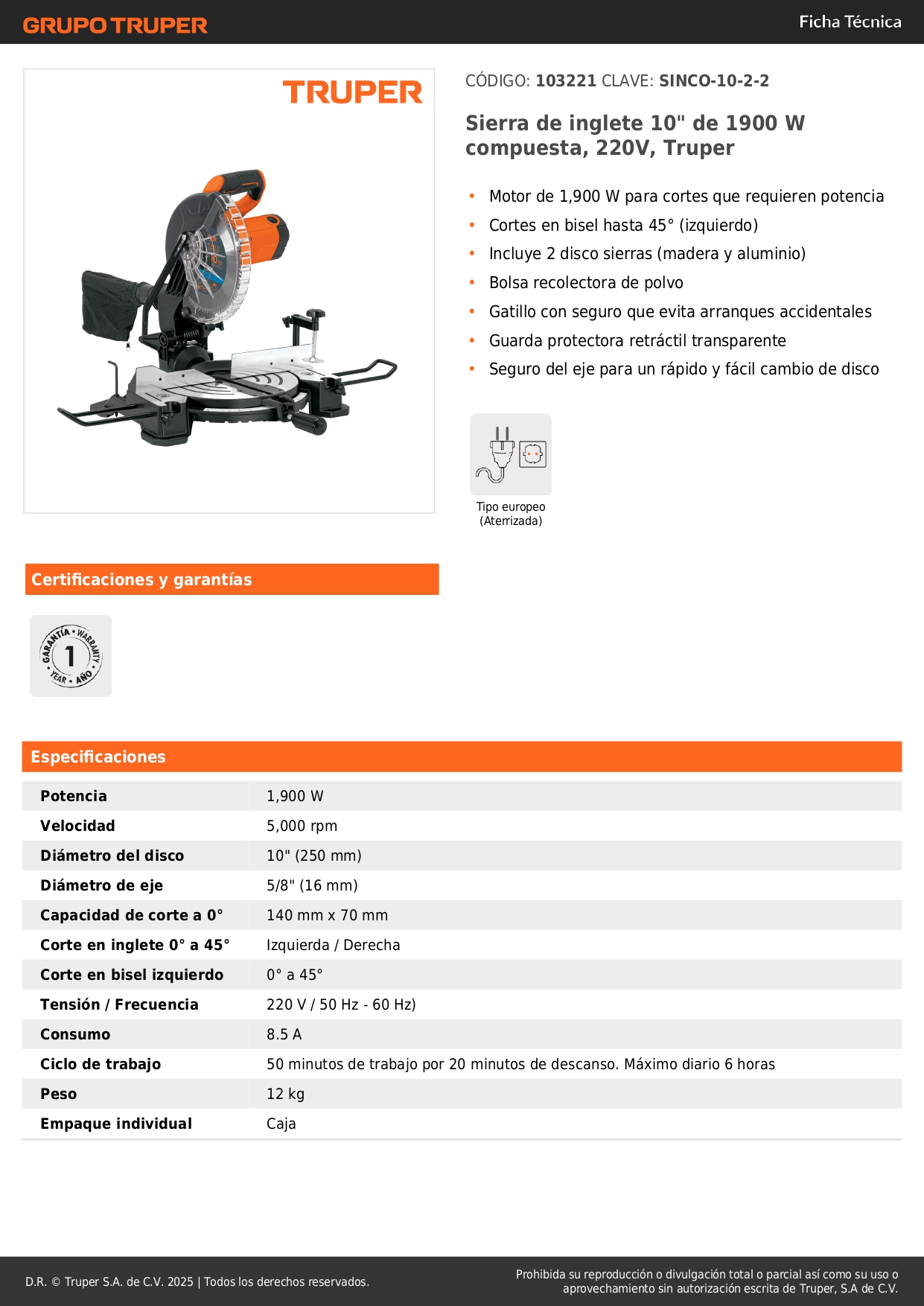 Sierra ingleteadora 10" 1900w compuesta 220v madera aluminio truper