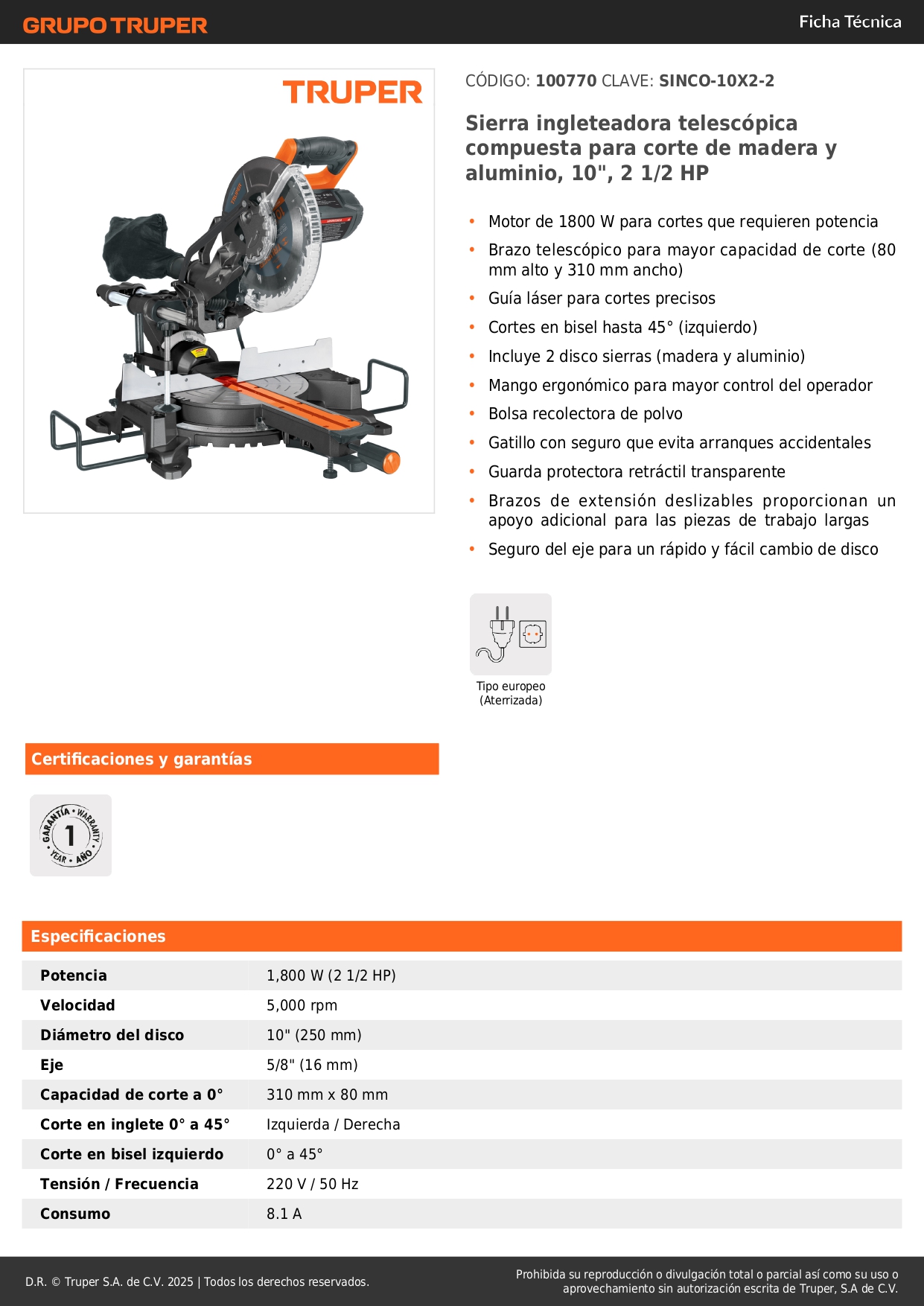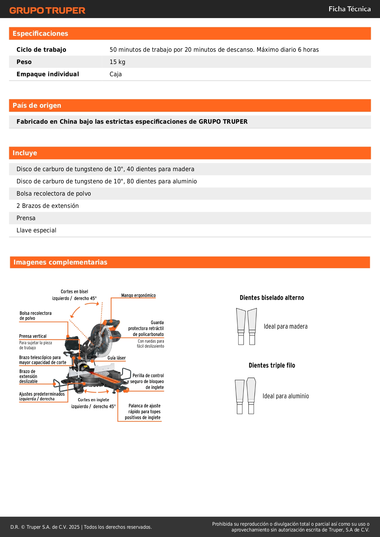 Sierra ingleteadora telescópica compuesta para corte de madera y aluminio, 10", 2 1/2 HP