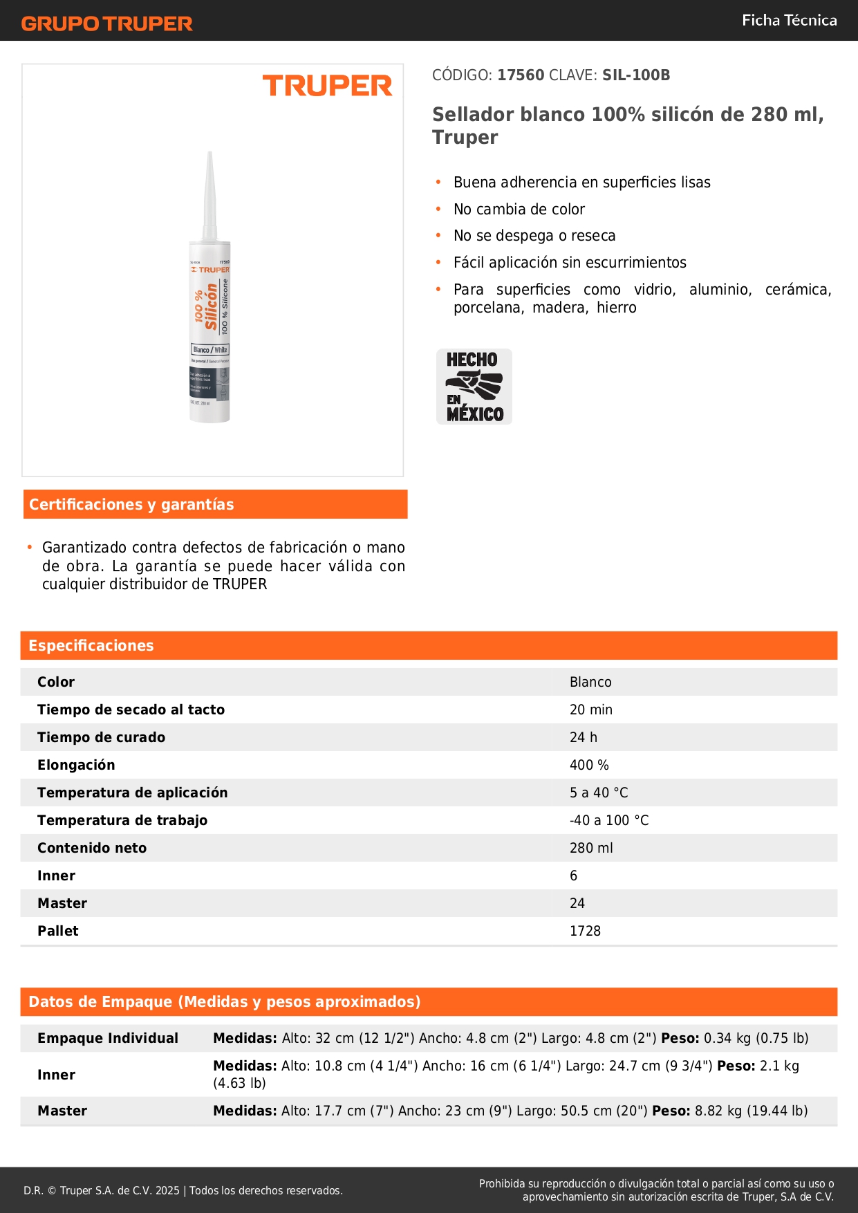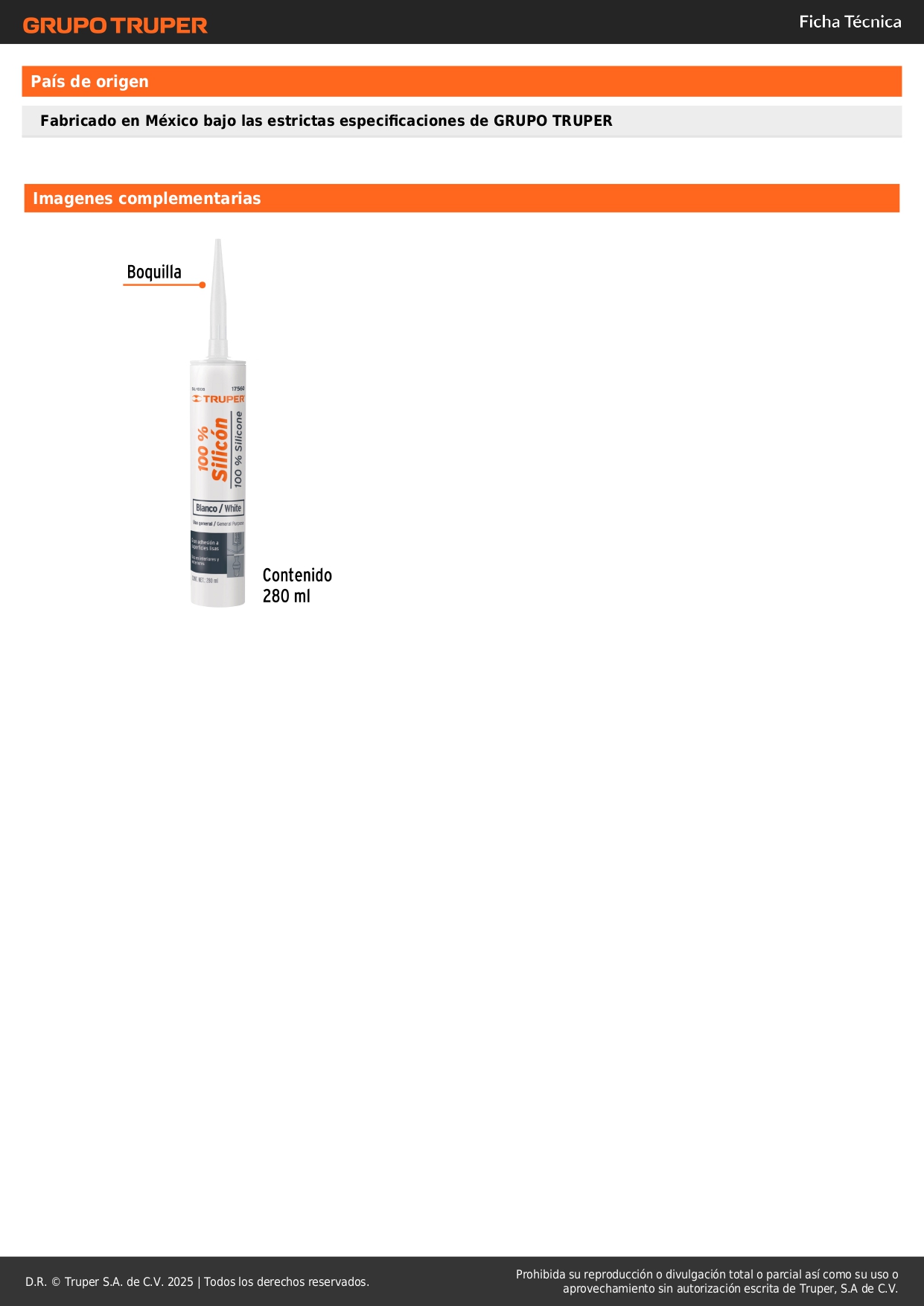 Silicona al 100% blanca de 280 ml, truper S/ 13.40 Agregar al carro Avísame cuando llegue -Buena adherencia en superficies lisas-No cambia de color-No se despega o reseca-Fácil aplicación sin escurrimientos-Para superficies como vidrio, aluminio, cerámica, porcelana, madera, hierro