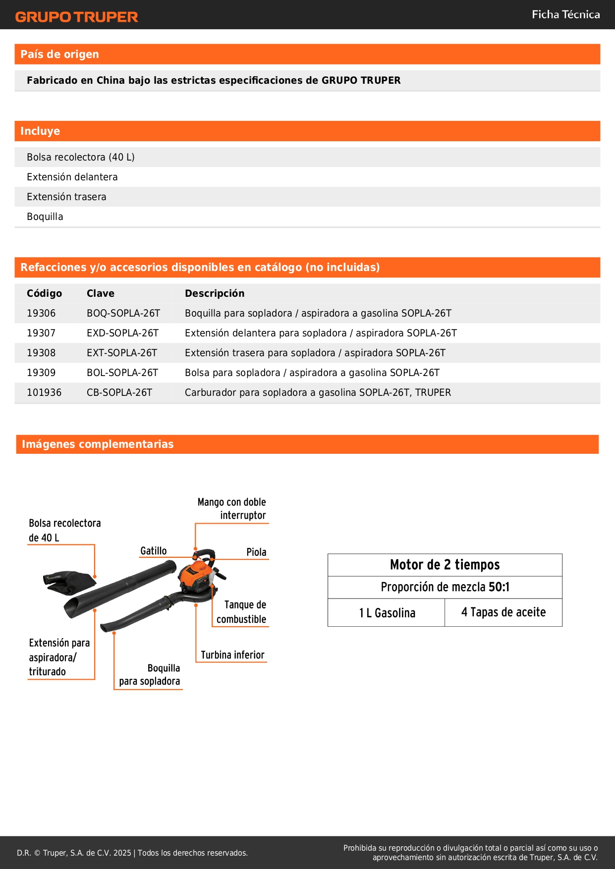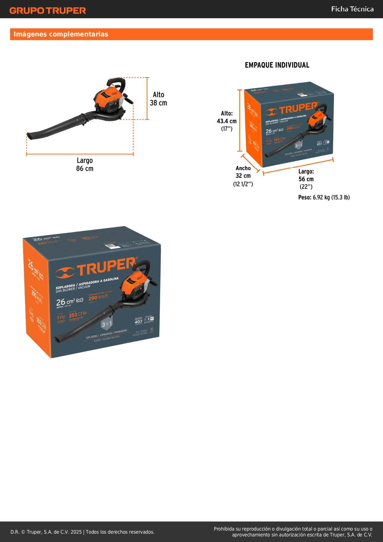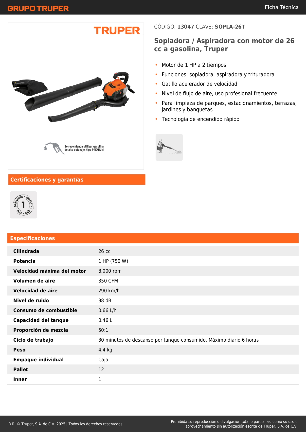 Sopladora / Aspiradora con motor de 26 cc a gasolina, Truper