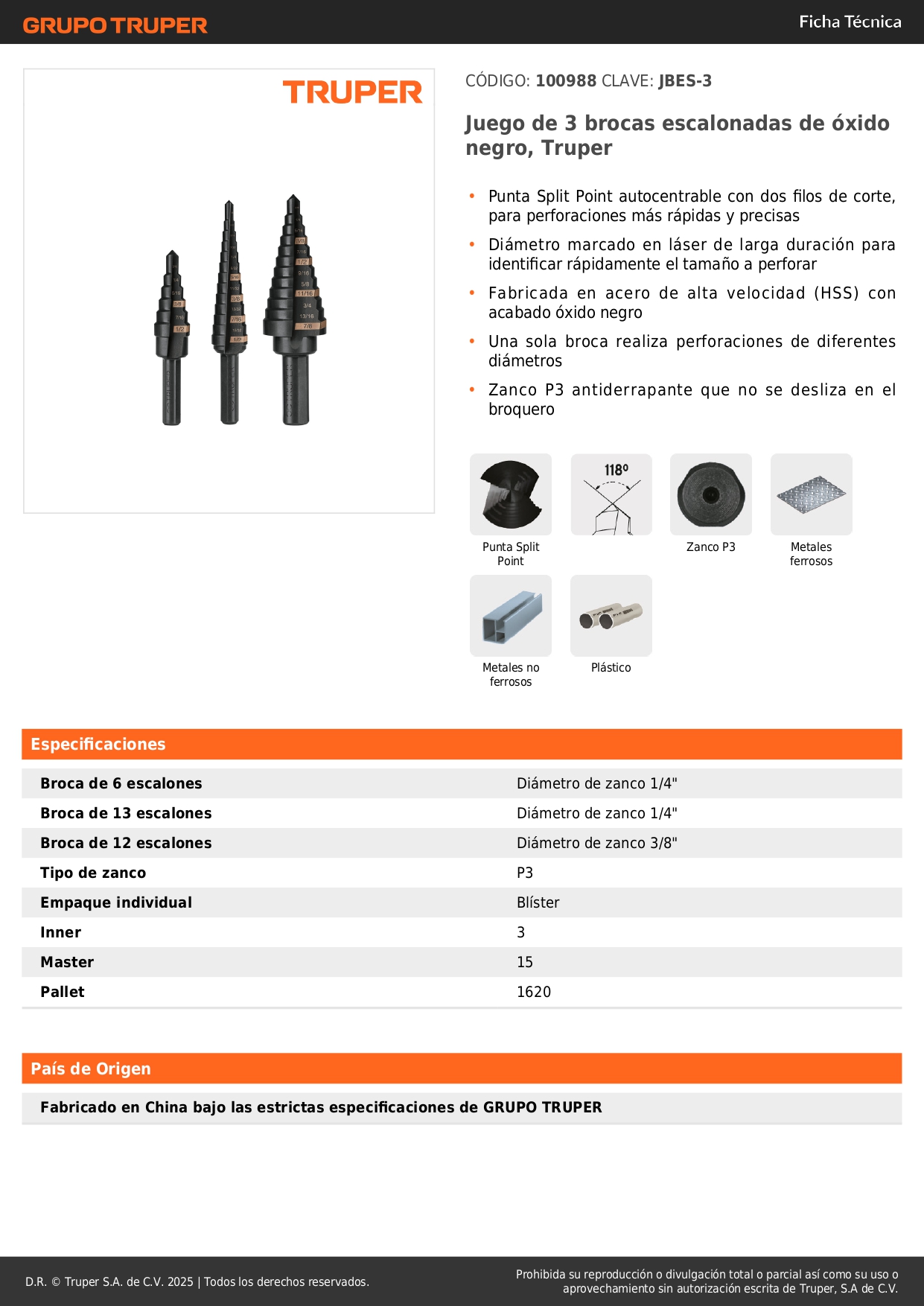 - Diámetro de zanco y largo (Broca 13 escalones) 1/4" / 77 mm