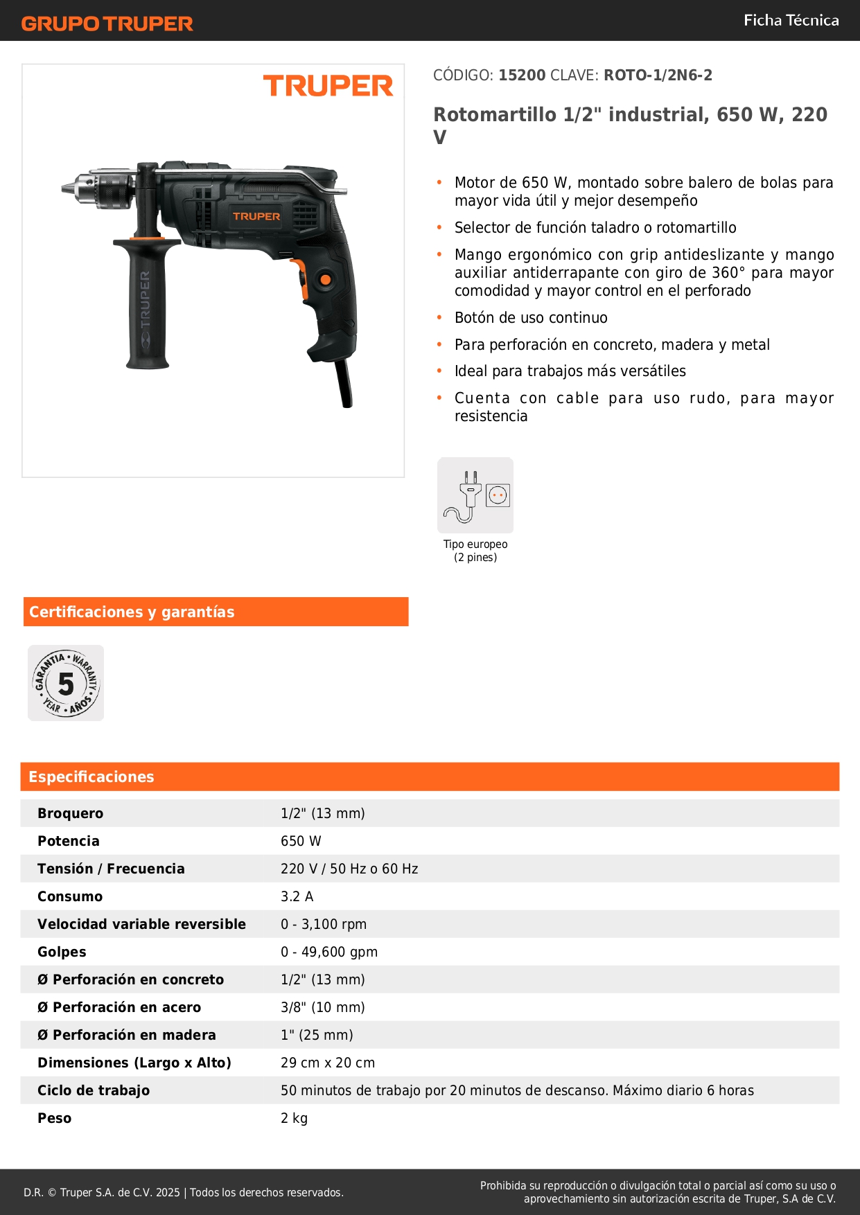 Rotomartillo 1/2" industrial, 650 W, 220 V
