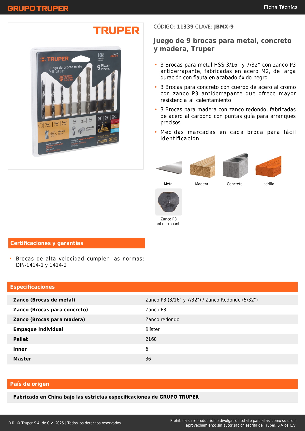Juego de 9 brocas para metal, concreto y madera, Truper