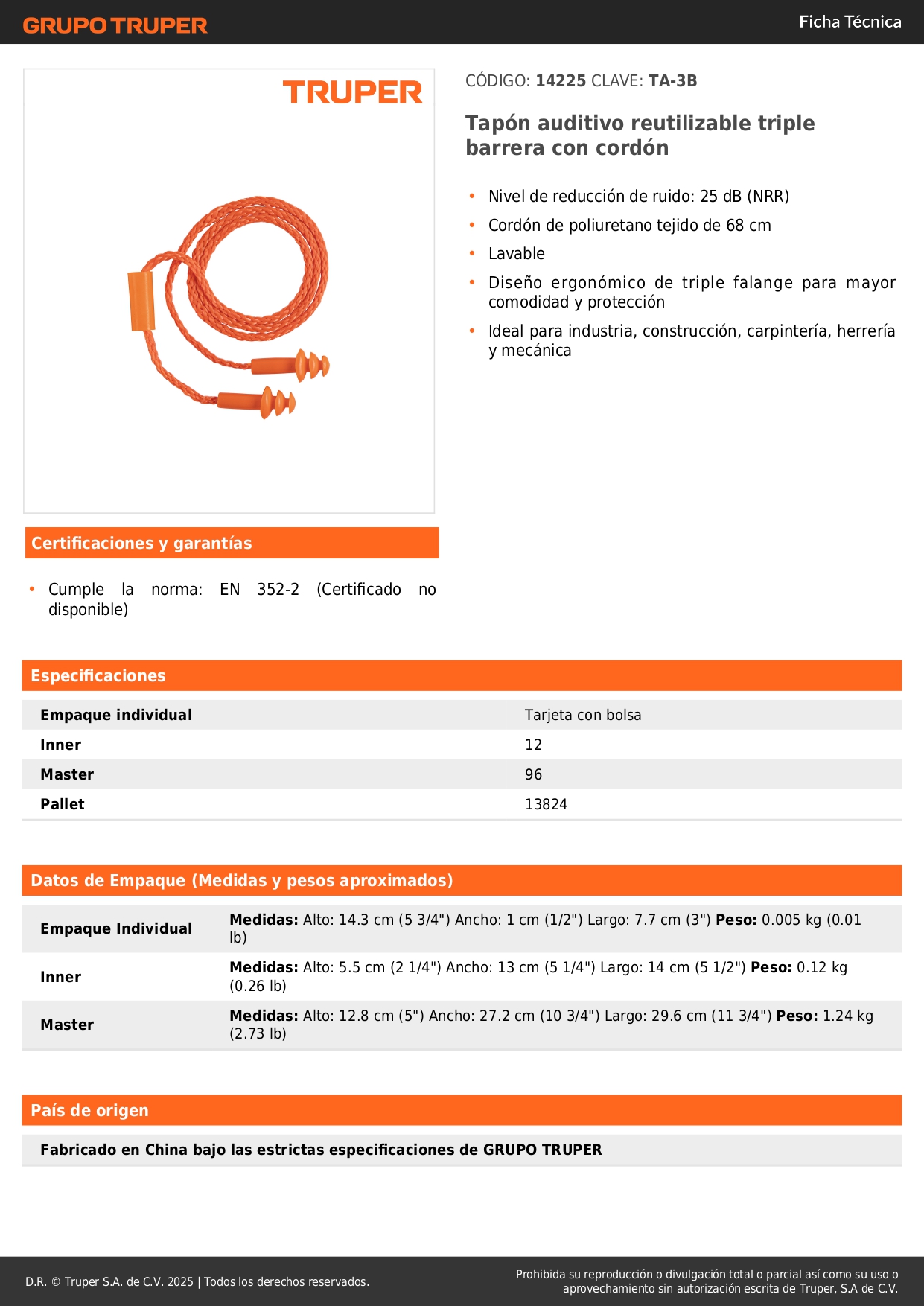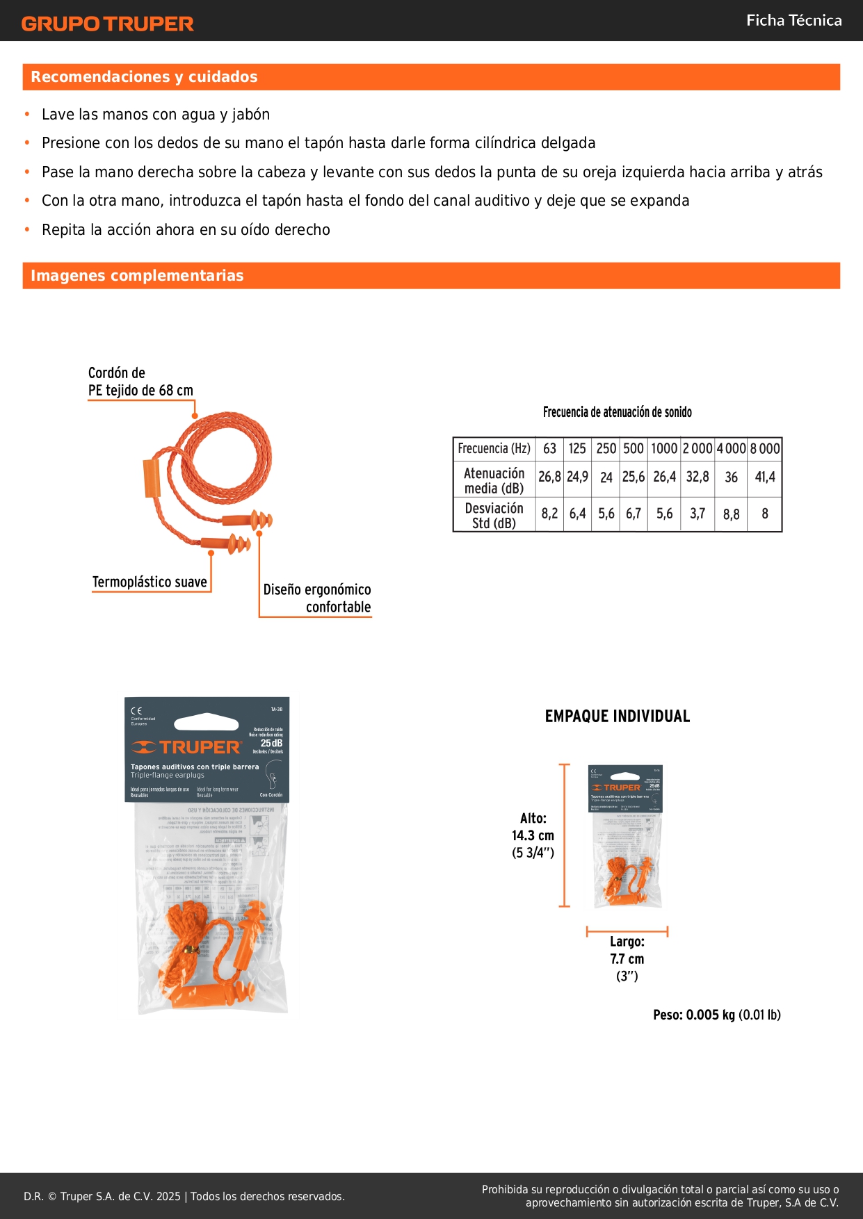 • Nivel de reducción de ruido: 25 dB (NRR)