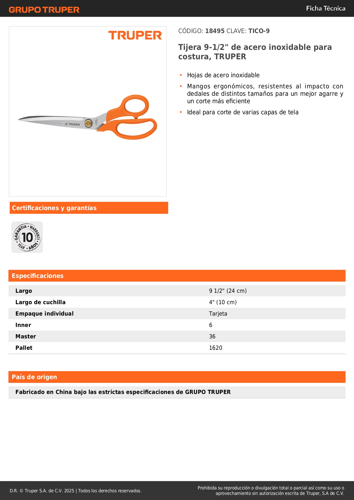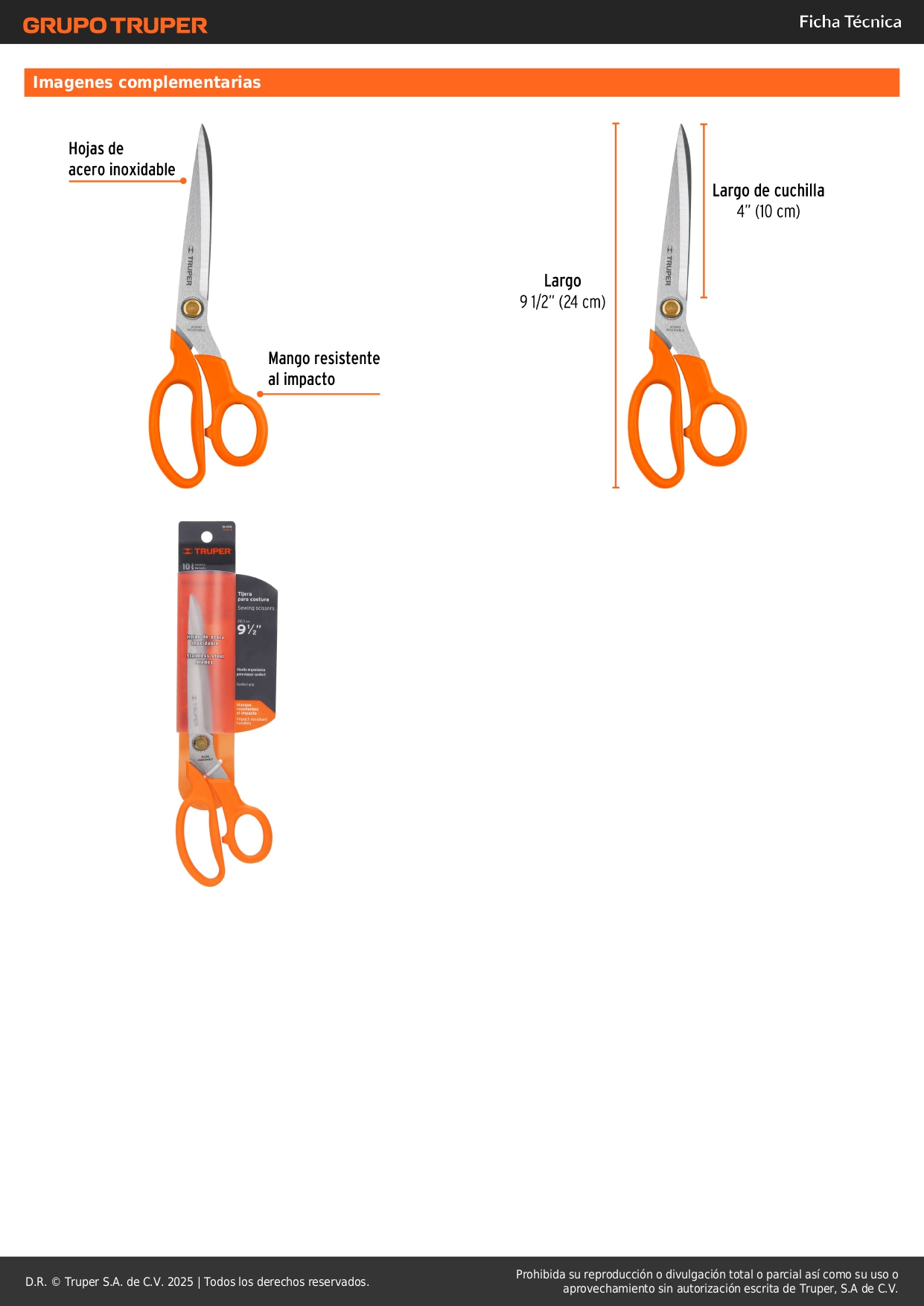 Tijera 9-1/2´´ de acero inoxidable para costura, truper S/ 24.80 Agregar al carro Avísame cuando llegue -Hojas de acero inoxidable-Mangos ergonómicos, resistentes al impacto con dedales de distintos tamaños para un mejor agarre y un corte más eficiente-Ideal para corte de varias capas de tela