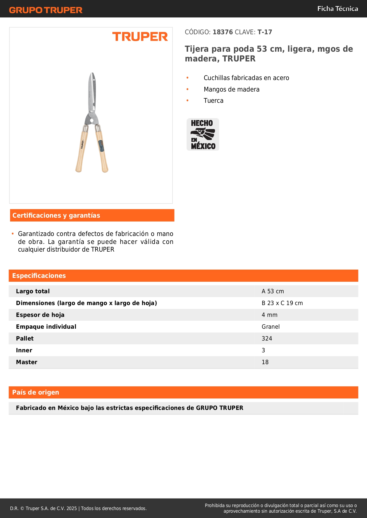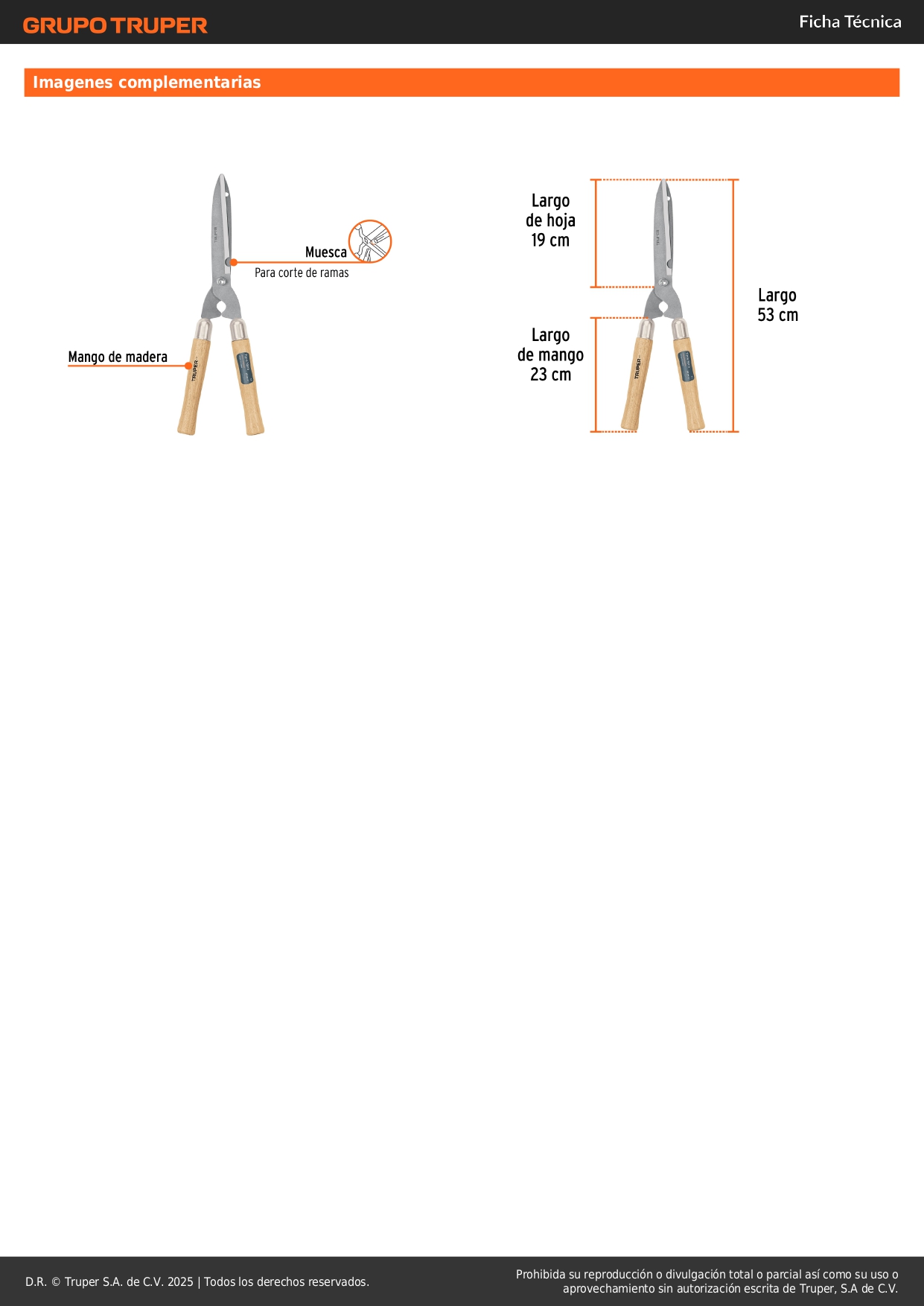 Tijera para poda 50 cm ligera mangos de madera truper S/ 28.00 Agregar al carro Avísame cuando llegue -Cuchillas fabricadas en acero-Mangos de madera-Tuerca