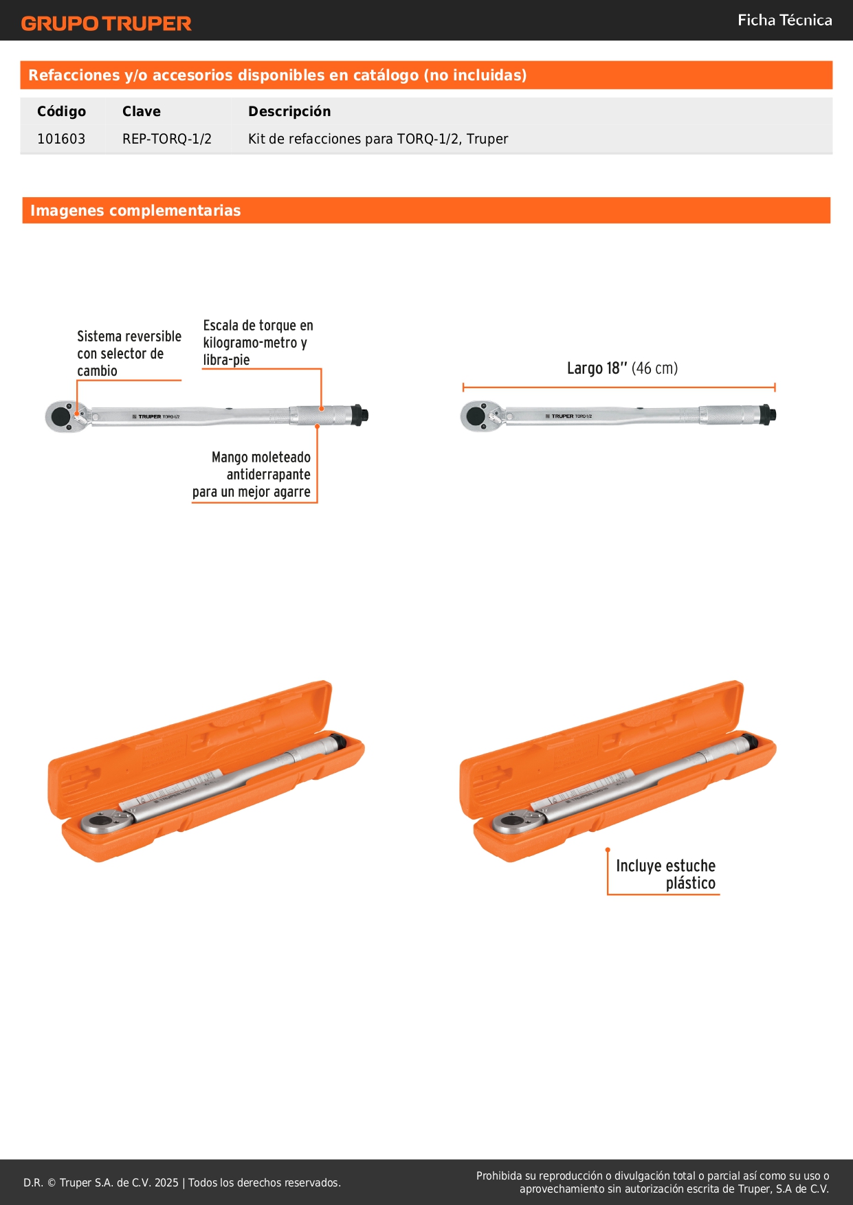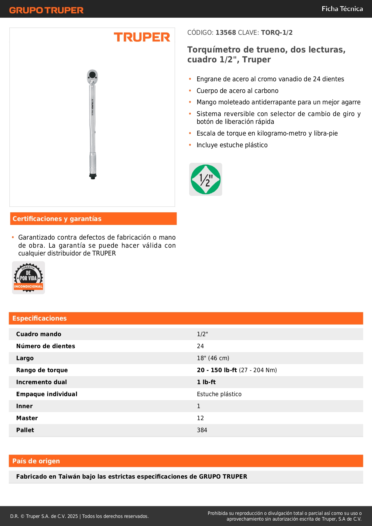 Torquímetro de trueno, dos lecturas, cuadro 1/2", Truper