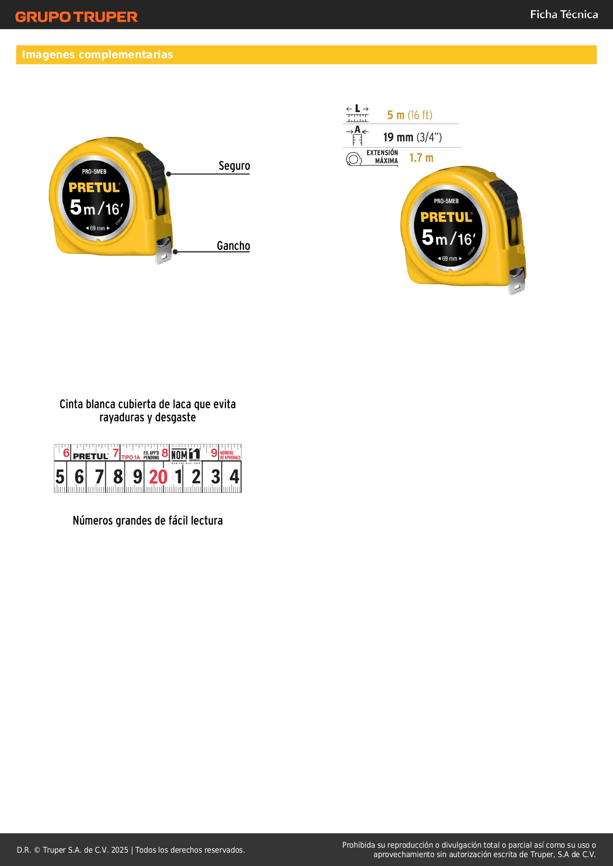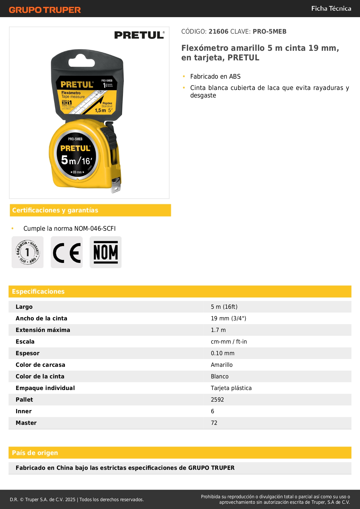 Wincha amarilla 5 m cinta 25 mm. en tarjeta. pretul
