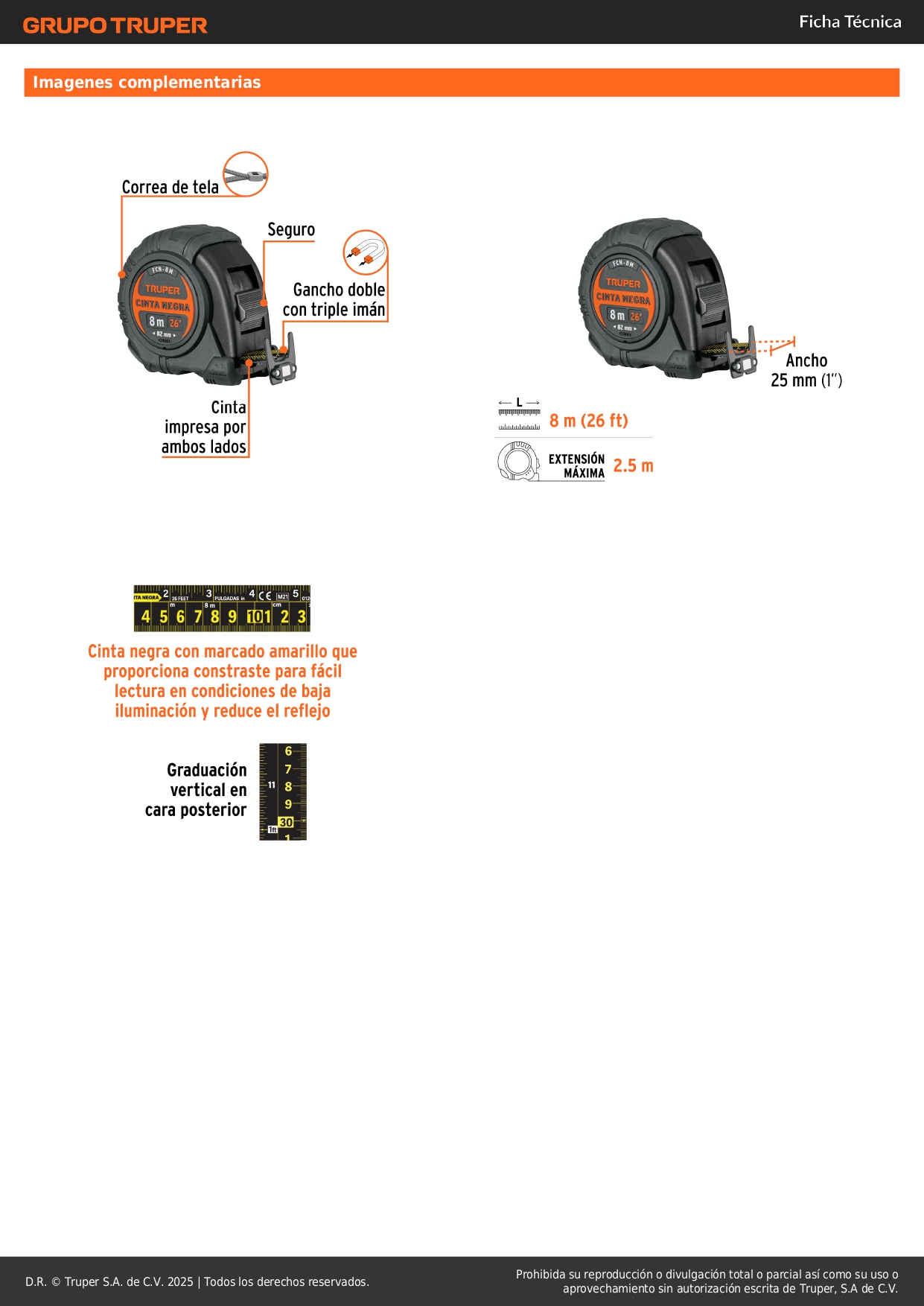 Flexómetro contra impactos 8 m, Cinta Negra 25 mm, Truper