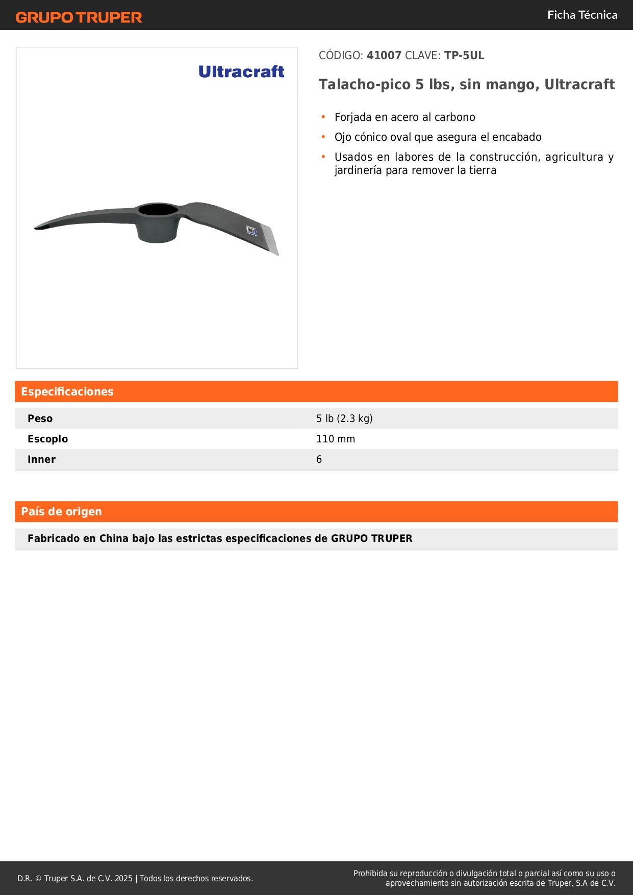 Talacho-pico 5 lbs, sin mango, Ultracraft